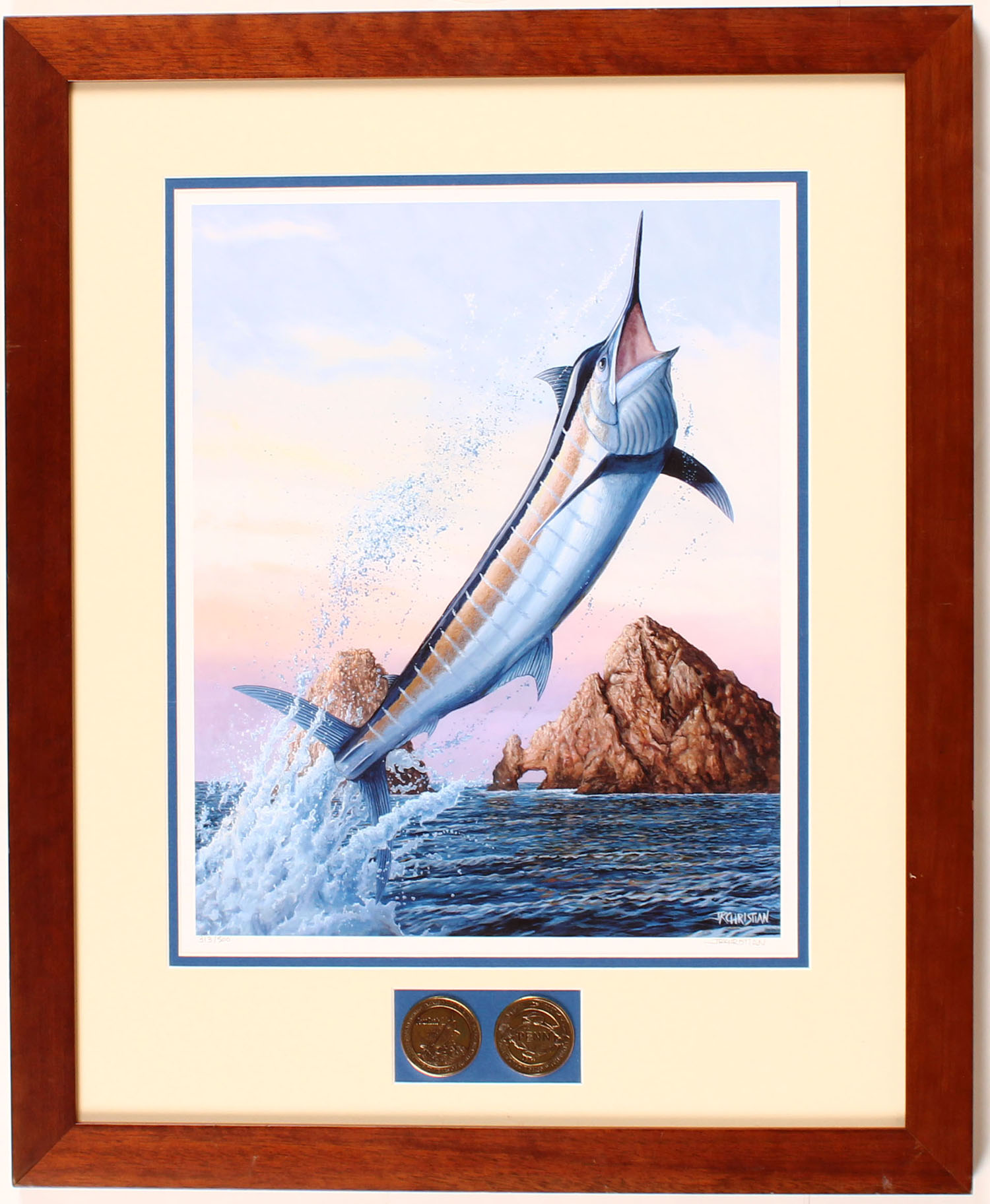 PENN Reels 75 year anniversary print, pictures full image of marlin jumping out of the ocean by J. Kchristian, 313/500, has two brass coins from Penn celebrating the 75th year anniversary, 11'' x 14'' image size, framed & matted. Grade: MINT - Value: 10 to 200