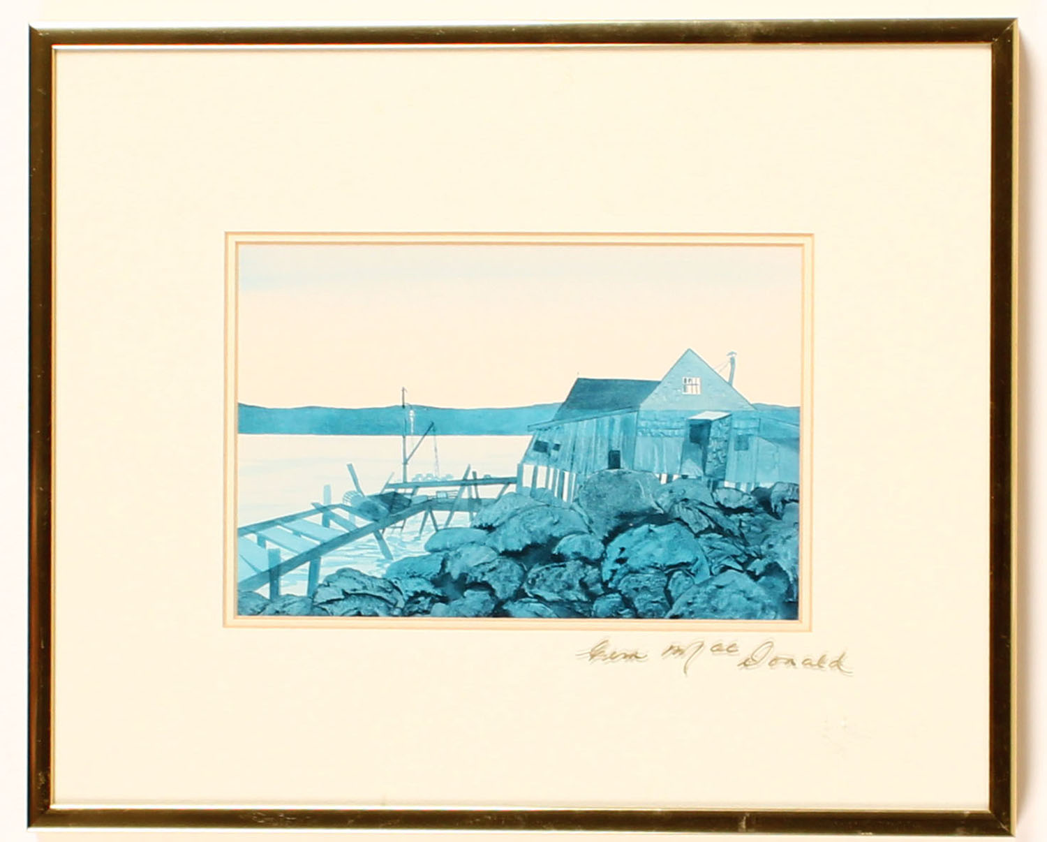 Cim MacDonald original pictures old lobster building on waters edge, signed on top of glass, 8'' x 5'' image size, framed & matted. Grade: Excellent - Value: 2 to 200