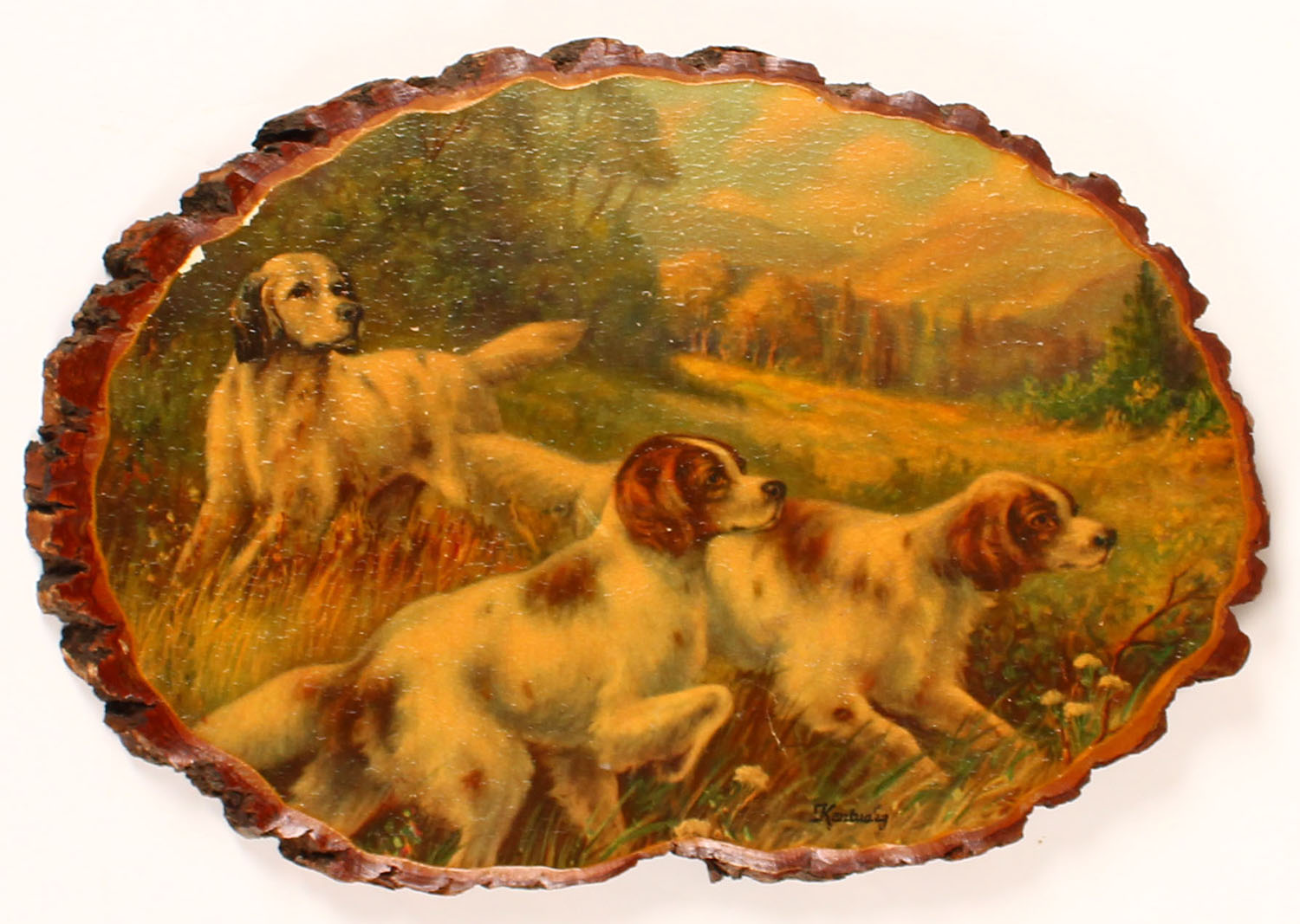 Kentuaey print of 3 english setters on wood, 17'' x 12''. Grade: Excellent - Value: 2 to 50