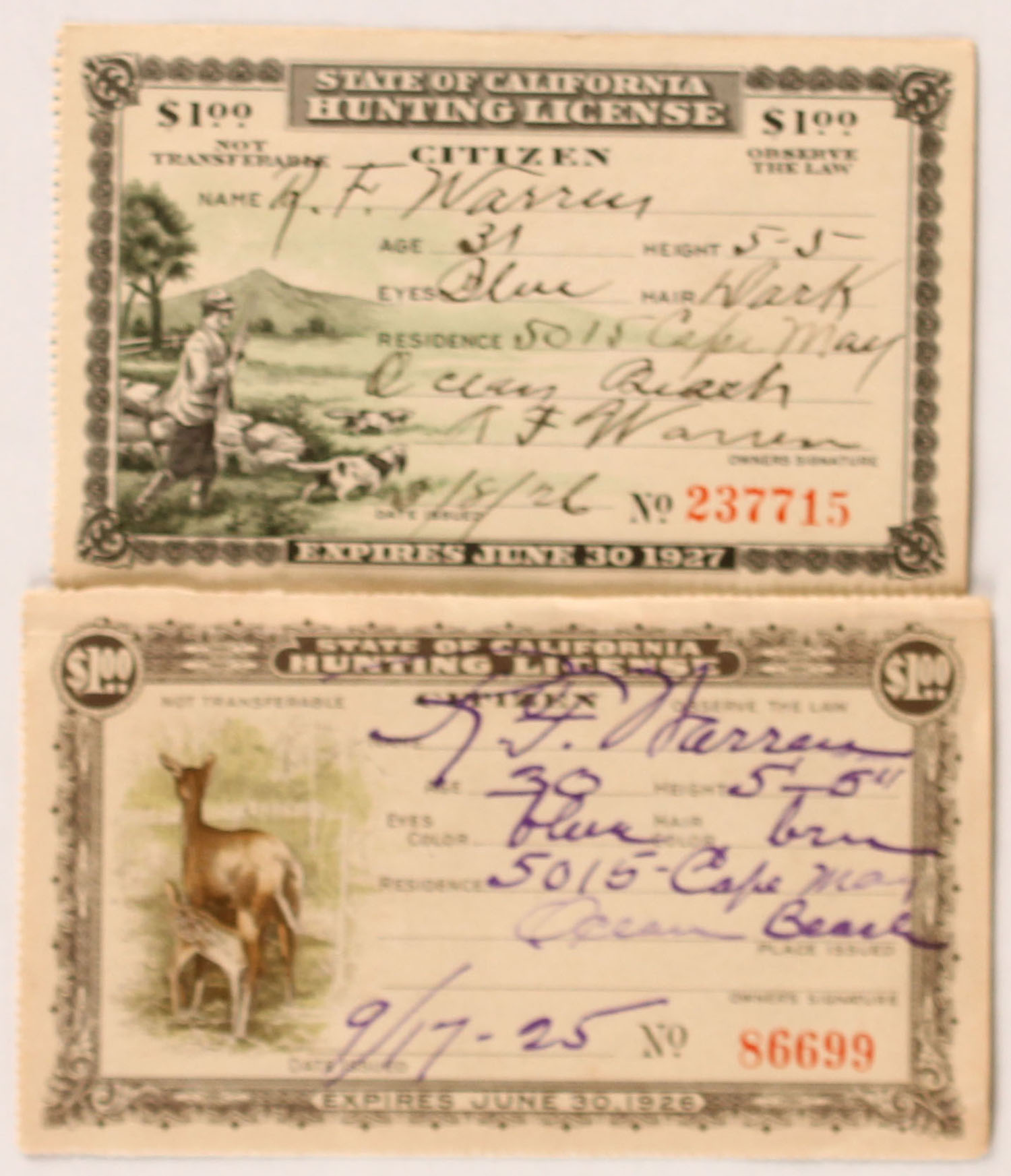 Lot of 2 California Hunting Licenses, 1926, 1927. Grade: Excellent - Value: 50 to 150