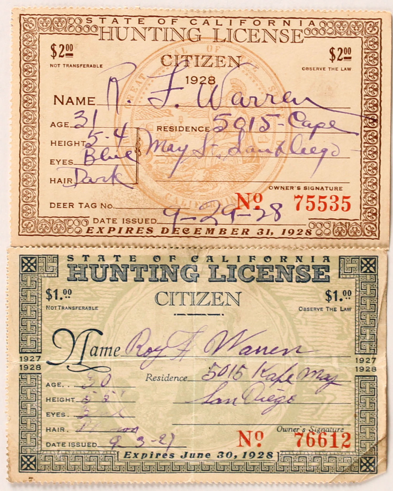 Lot of 2 Unusual California Hunting Licenses, Both are 1928 but have different expire dates 12-31-1928 & 06-30-1928. Grade: Excellent - Value: 10 to 100