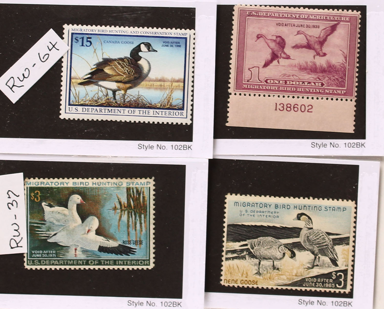 Lot of 4 Federal Duck Stamps, all unsigned with glue on backs, RW-5, RW-31, RW-37 & RW-64. Grade: MINT - Value: 20 to 80