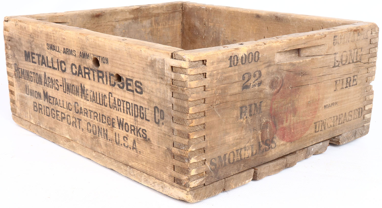 Remington UMC, 22 Long, tongue and groove construction wood shipping crate, black & red print has faded and the crate has age soiling. Grade: Very Good - Value: 10 to 50