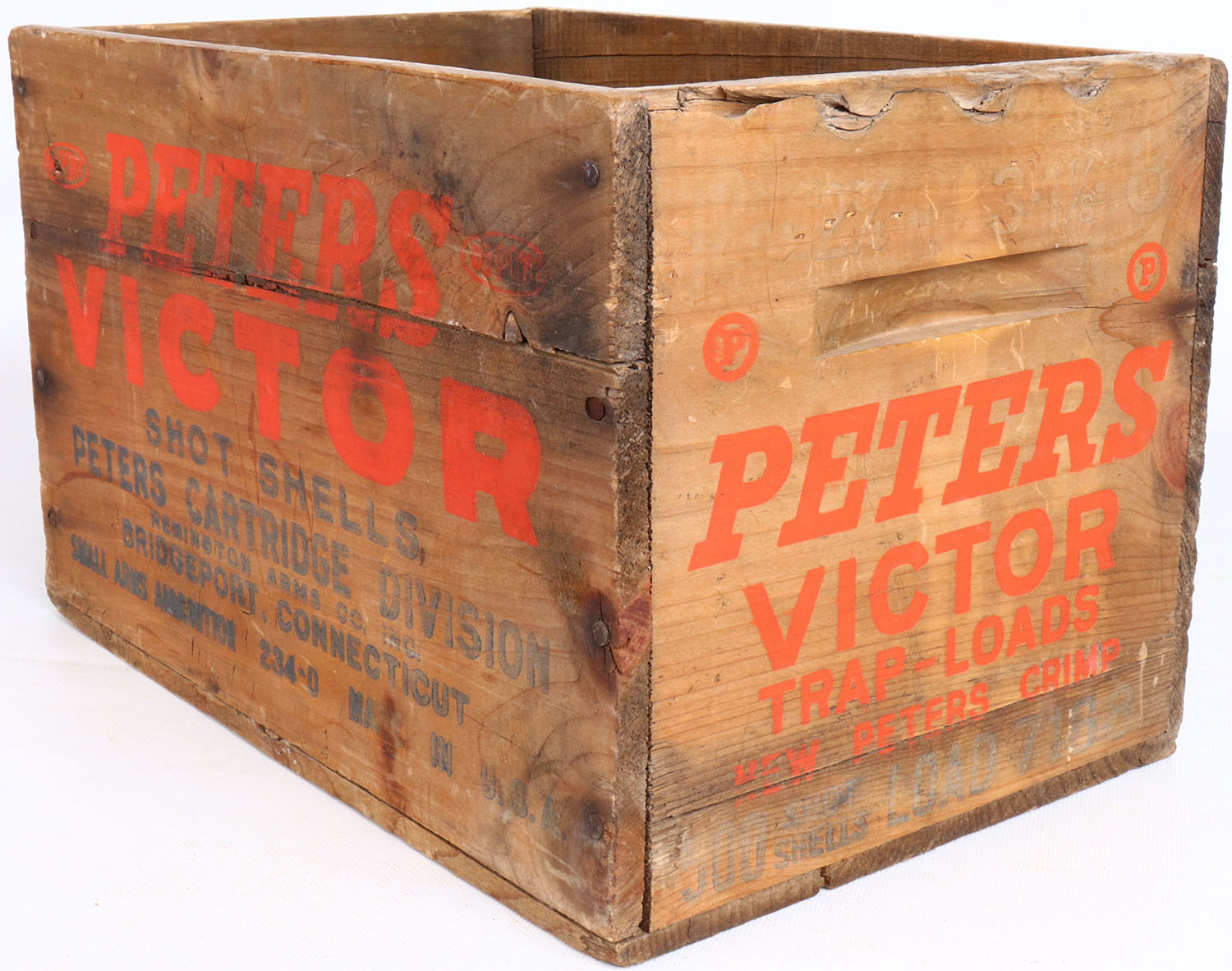 Peters Victor 12 ga., tongue and groove construction, orange & blue print is faded, crate has age soiling. Grade: Very Good - Value: 10 to 50