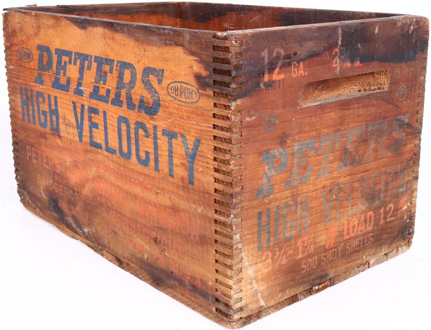 Peters High Velocity 12 ga. ga., tongue and groove construction, orange & blue print is faded, crate has age soiling. Grade: Very Good - Value: 6 to 40