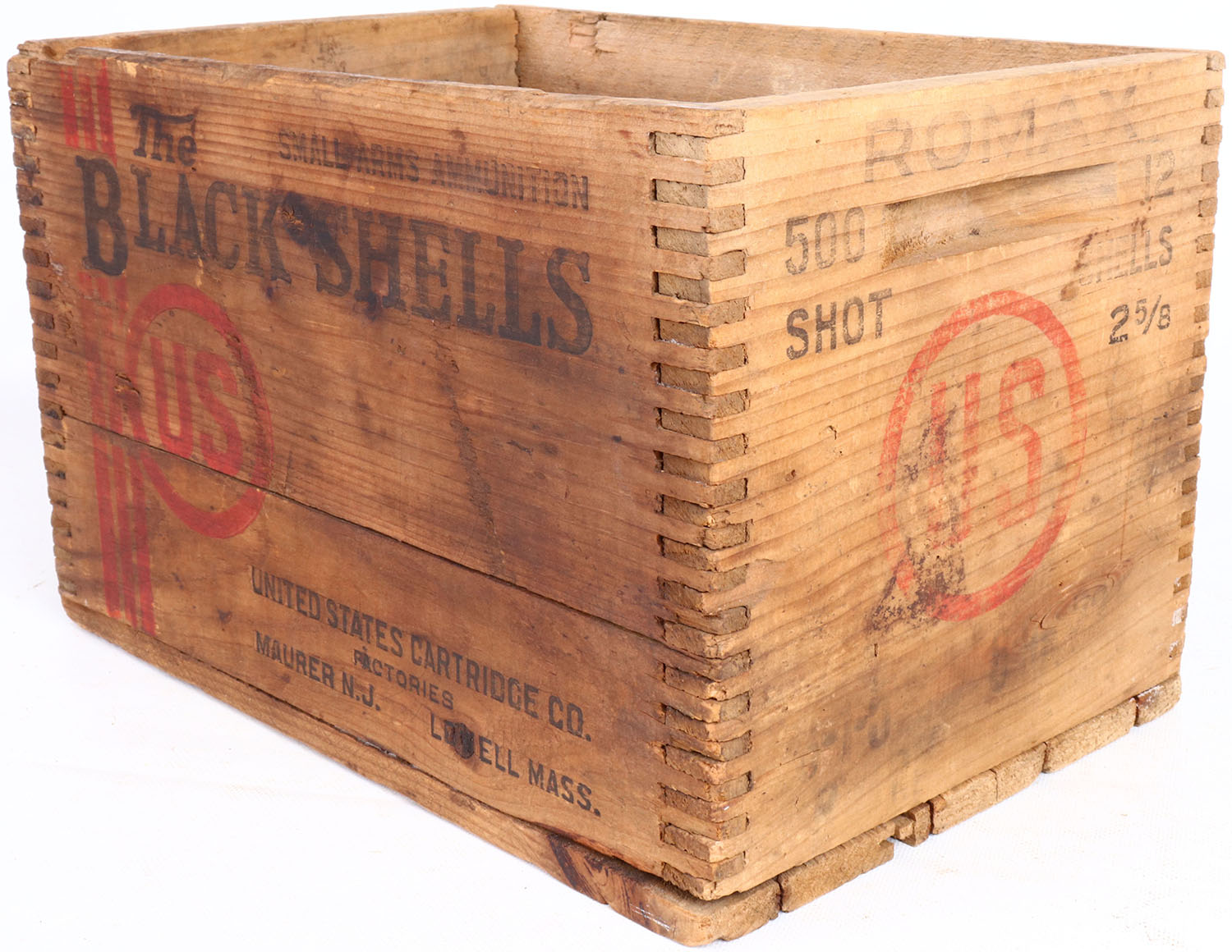 US Climax, The Black Shells, 12 ga., ROMAX, tongue and groove construction wood shipping crate, red & black print has fading, crate has scuffing. Grade: Very Good - Value: 10 to 50