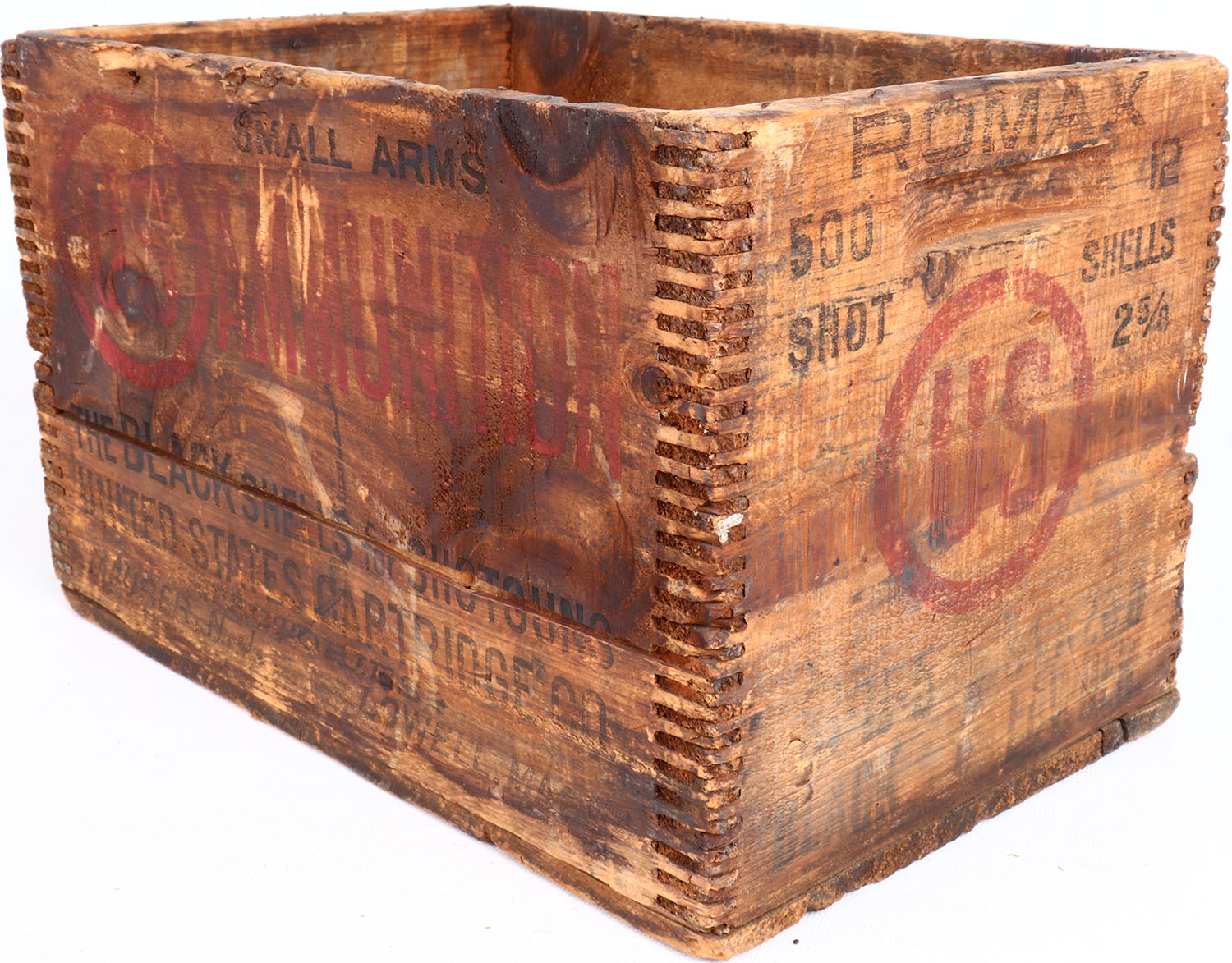 US Romax, 12 ga., Smokeless, tongue and groove construction wood shipping crate, red & black print is faded, crate has age soiling. Grade: Very Good - Value: 2 to 40