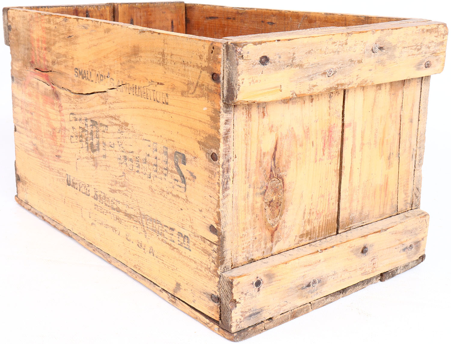 US Defiance, 12 ga., Smokeless, nail construction wood shipping crate, red & black print faded completely off, crate has age soiling. Grade: Good - Value: 2 to 20