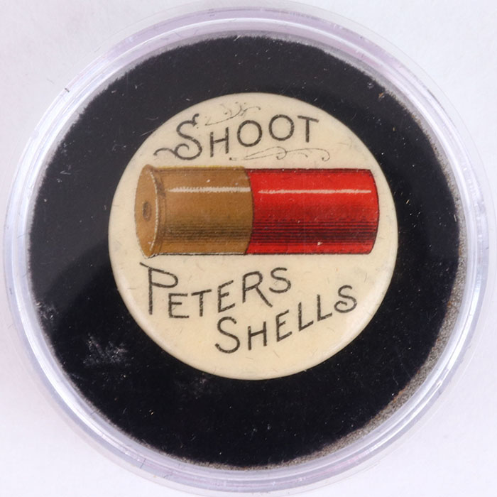 Peters Pinback, ''Shoot Peters Shells'', 7/8'', Whitehead & Hoag paperback, pin and paperback are bright and clean . Grade: Excellent ++ - Value: 10 to 50