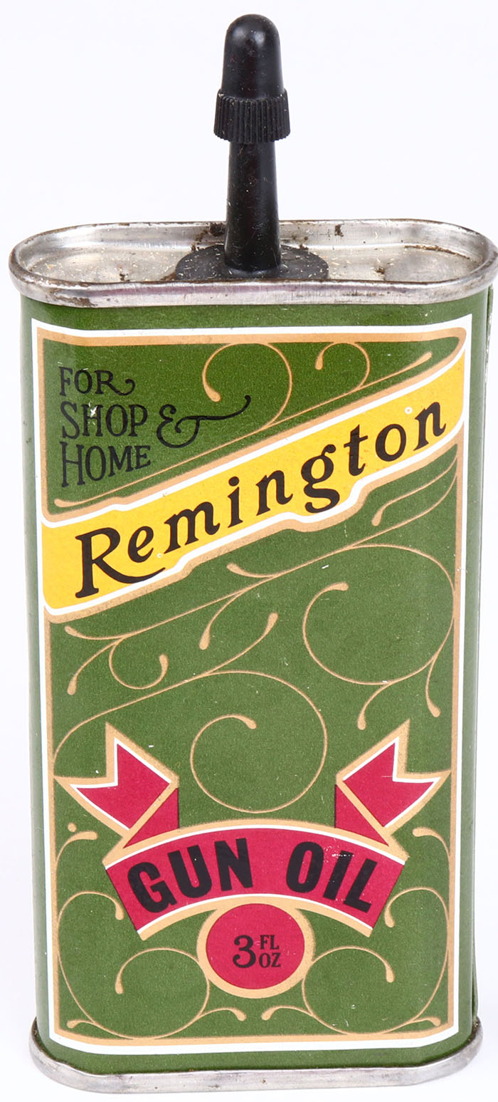 Remington Gun oil tin, plastic spout & Cap, Full, all bright and clean. Grade: Excellent + - Value: 2 to 40