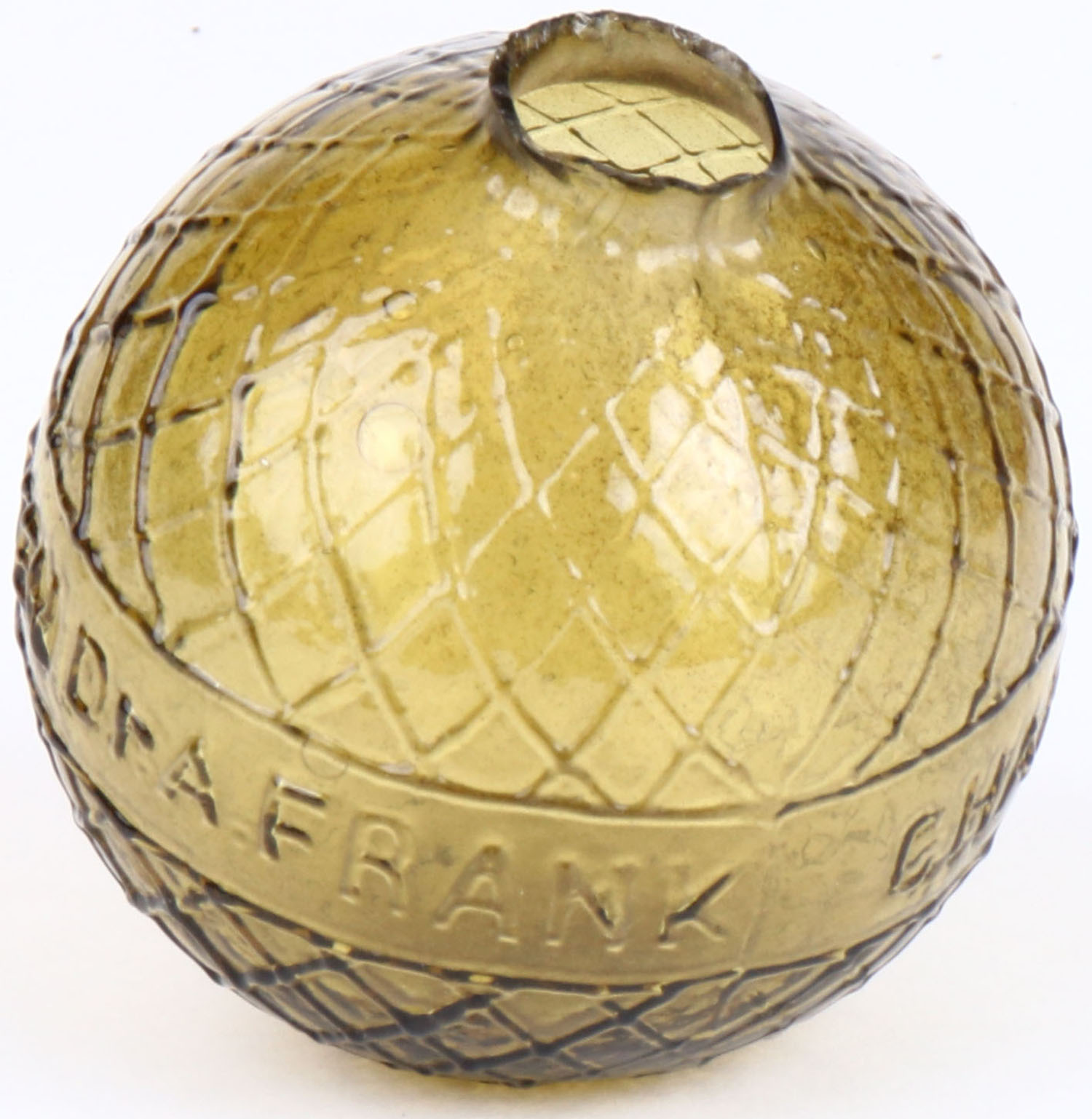 RARE! Yellowish amber Glass Target Ball, square pattern, ''Dr. A. Frank Charlottenburg Glashutten'', 2 5/8'' dia., low neck, circa 1880-1900. Grade: Excellent ++ - Value: 300 to 600