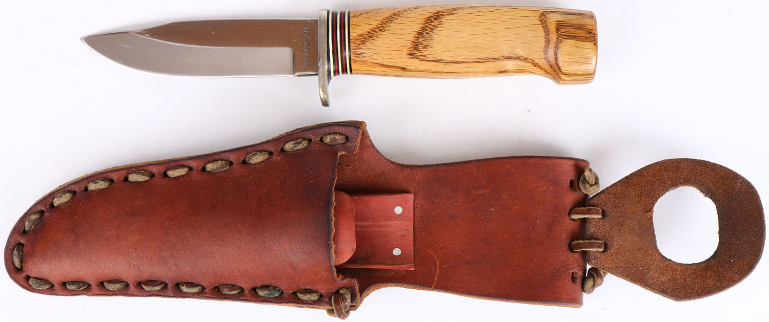 RARE! S. Morseth fixed blade knife, circa 1980, 4'' blade, has deluxe custom sheath, exotic zebra wood handle, D2 stee blade, half hilt, sheath has hard liner and laced with raw hide strips, knife is very bright and clean with just a couple of scratches, knife fits into heath perfectly, all very nice! - Value: 200 to 600