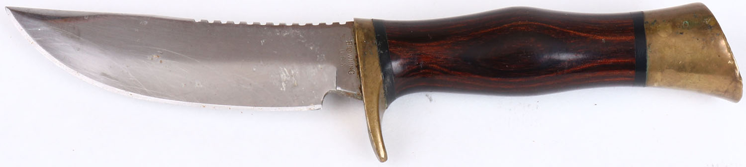 Browning fixed blade knife, wood handle with brass pommel and half hilt, has age soiling, 4 1/2'' blade. Grade: Excellent - Value: 30 to 90