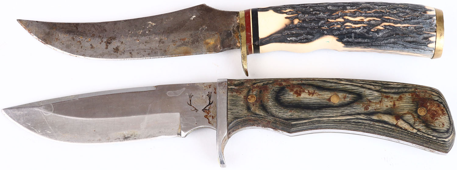 Lot of 2 Fixed blade knives, Cabela's and Schrade, both have lots of age soiling, 5'' blade. Grade: Good + - Value: 16 to 80