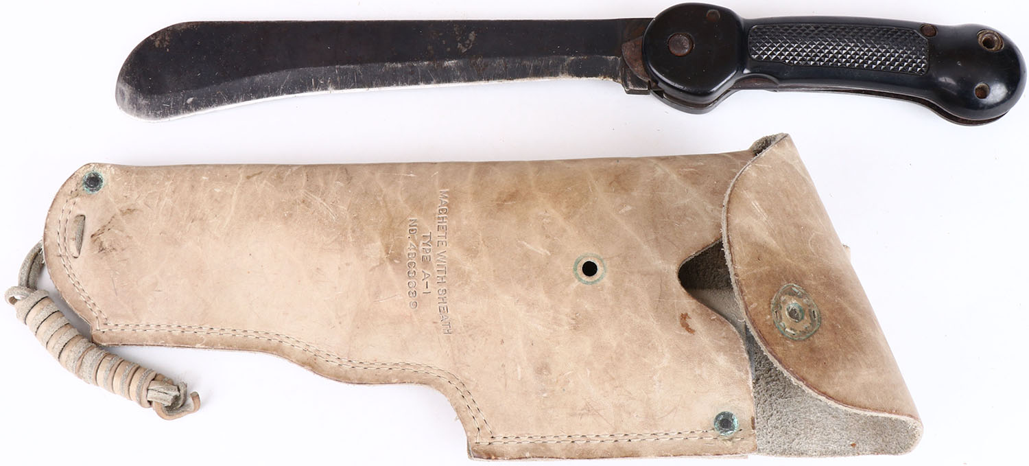 Folding machete with leather sheath, base of blade marked Imperial, 10'' blade, has rust and age soiling. Grade: Very Good - Value: 40 to 100
