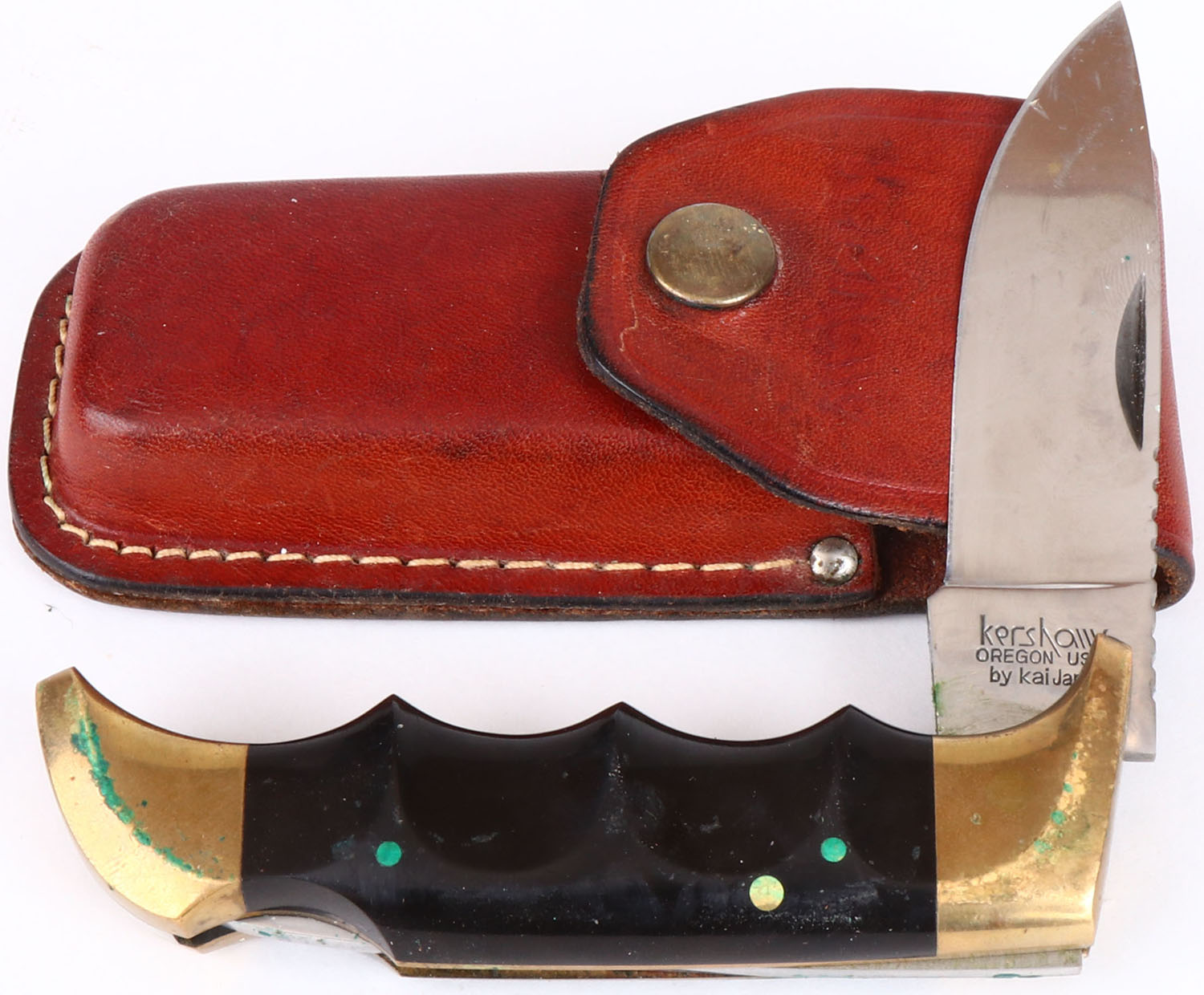 Kershaw folding knife, 3 1/2'' blade, blade and handle have age soiling, has leather sheath. Grade: Very Good - Value: 20 to 200