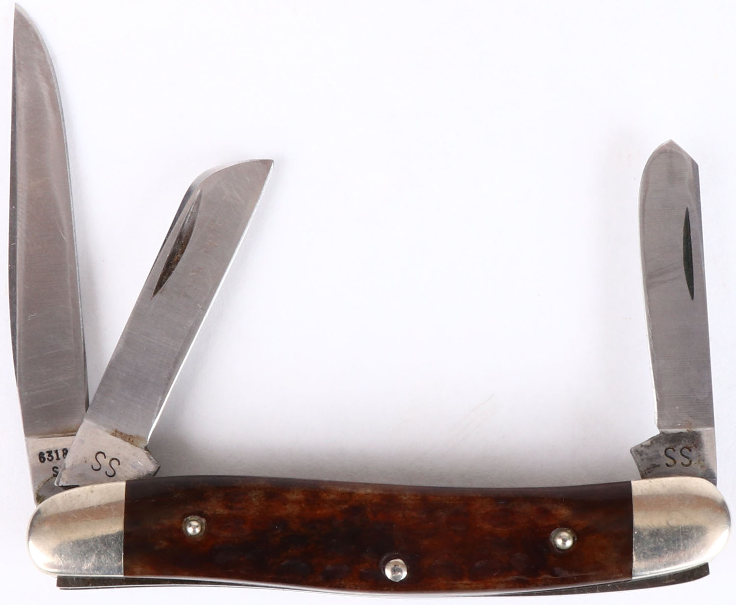 Case folding knife, 3 blades, 2 1/4'' longest blade, all bright and clean. Grade: Excellent - Value: 20 to 80