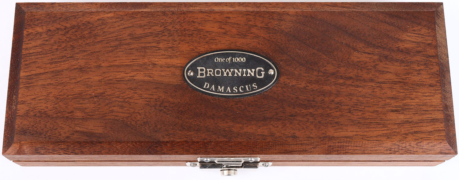 RARE! Browning Model 3816 Double edged Damascus Hunter fixed blade knife, cocobolo wood handle, blade is 3 5/8'' long, in orignal wood box and with orignal shipping box, 1 of 1000, #507. Grade: MINT - Value: 400 to 800