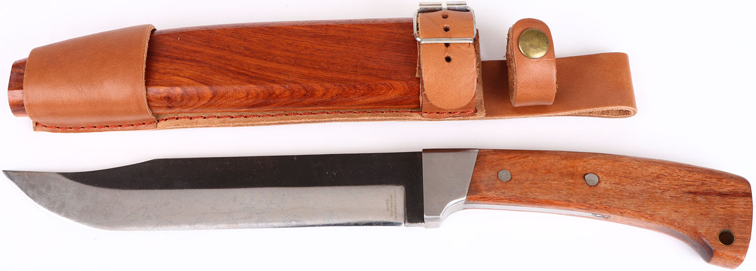 Large fixed blade knife, with wood and leather sheath, 8'' blade, BK1303, wood handle, solid and shows some use. Grade: Excellent - Value: 20 to 80