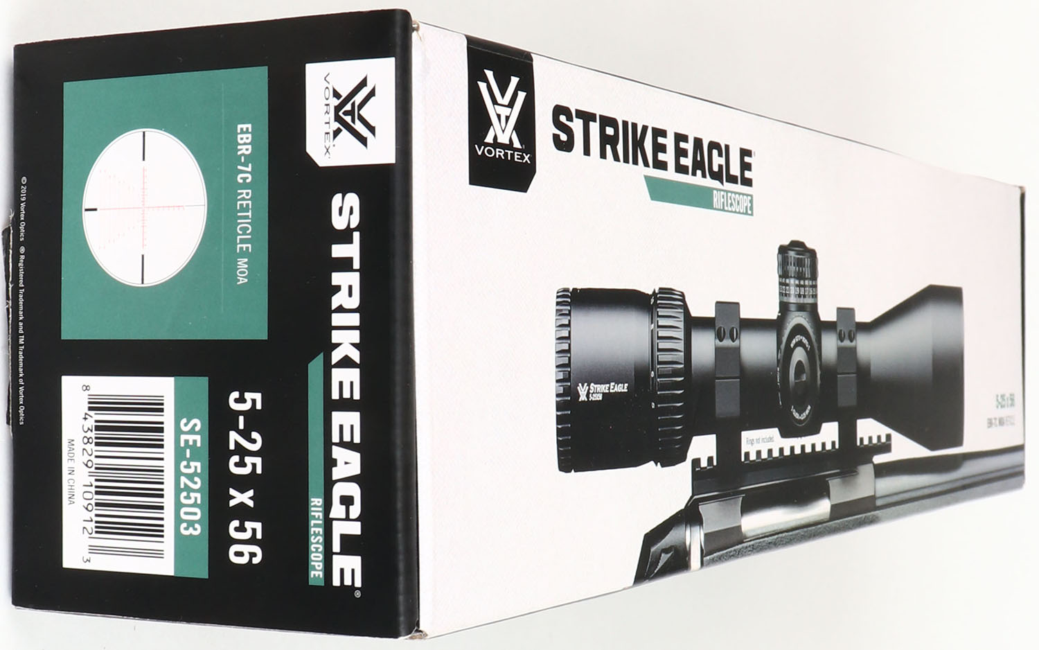 Vortex, Strike Eagle, 5-25 x 56mm, Variable Magnification Rifle Scope, NIB, 34mm Tube Diameter, First Focal Plane EBR-7C (MOA) Illuminated Reticle, Adjustable Parallax from 15 Yards to Infinity, Fast Focus Eyepiece, Nitrogen Gas Purged Housing, Waterproof, Fog proof, Shock Proof, 3.7 Inches of eye relief, 14.6 Inches long, weighs 30.4 Ounces, Medium Height exposed locking turrets have 110 MOA of internal adjustment for elevation and 78 MOA for windage, 1/4 MOA Clicks, very small amount of play between clicks but overall very positive and audible, Fully Multi-Coated Glass is outstanding, comes with RZR Zero Stop, Sun Shade, cleaning cloth, CR2032 Battery, and the unmatched Vortex VIP Unconditional Warranty. Grade: MINT - Value: 800 to 1000