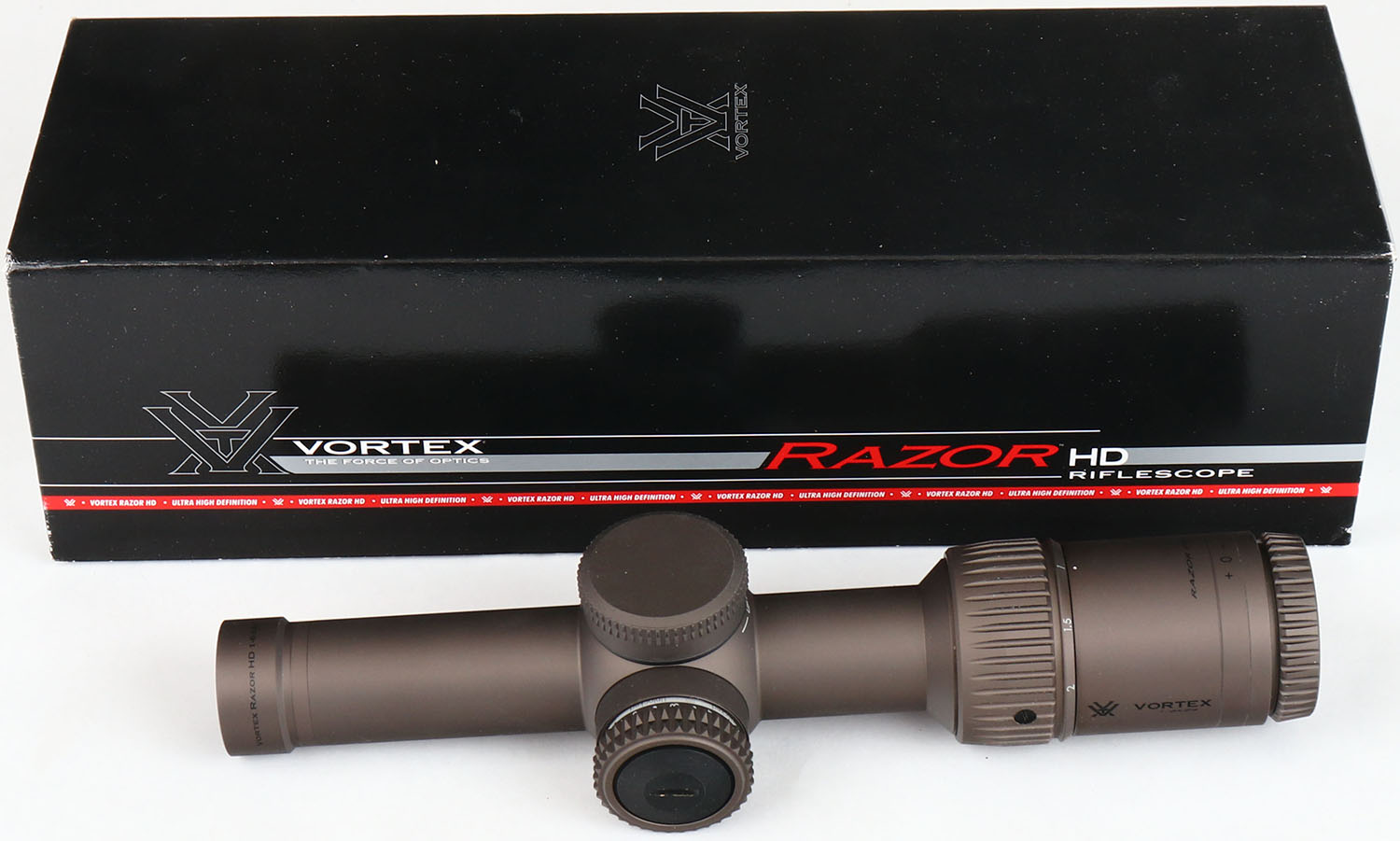 Vortex, RazorHD Gen II, 1-6 x 24mm, LPVO Rifle Scope, JM-1 (MOA) Illuminated Reticle, Matte Stealth Shadow Black Finish, Waterproof, Fog proof, Shockproof, Second focal plane, 30mm Tube diameter, Low profile finger adjustable turrets are capped, weighs in at 21.5 ounces, 10 inches overall length, 4 inches of eye relief, fast focus eyepiece, parallax fixed at 100 yards, 1/2 MOA adjustments, clicks are positive and audible, locking illumination, XRPlus Fully Multi-Coated Japanese glass is beautiful - clear and unblemished with a very large sight picture, comes with 1 CR2032 battery as well as the Vortex VIP Unconditional Warranty, Scope is MINT, box has minor wear. Grade: Excellent ++ - Value: 1200 to 2400
