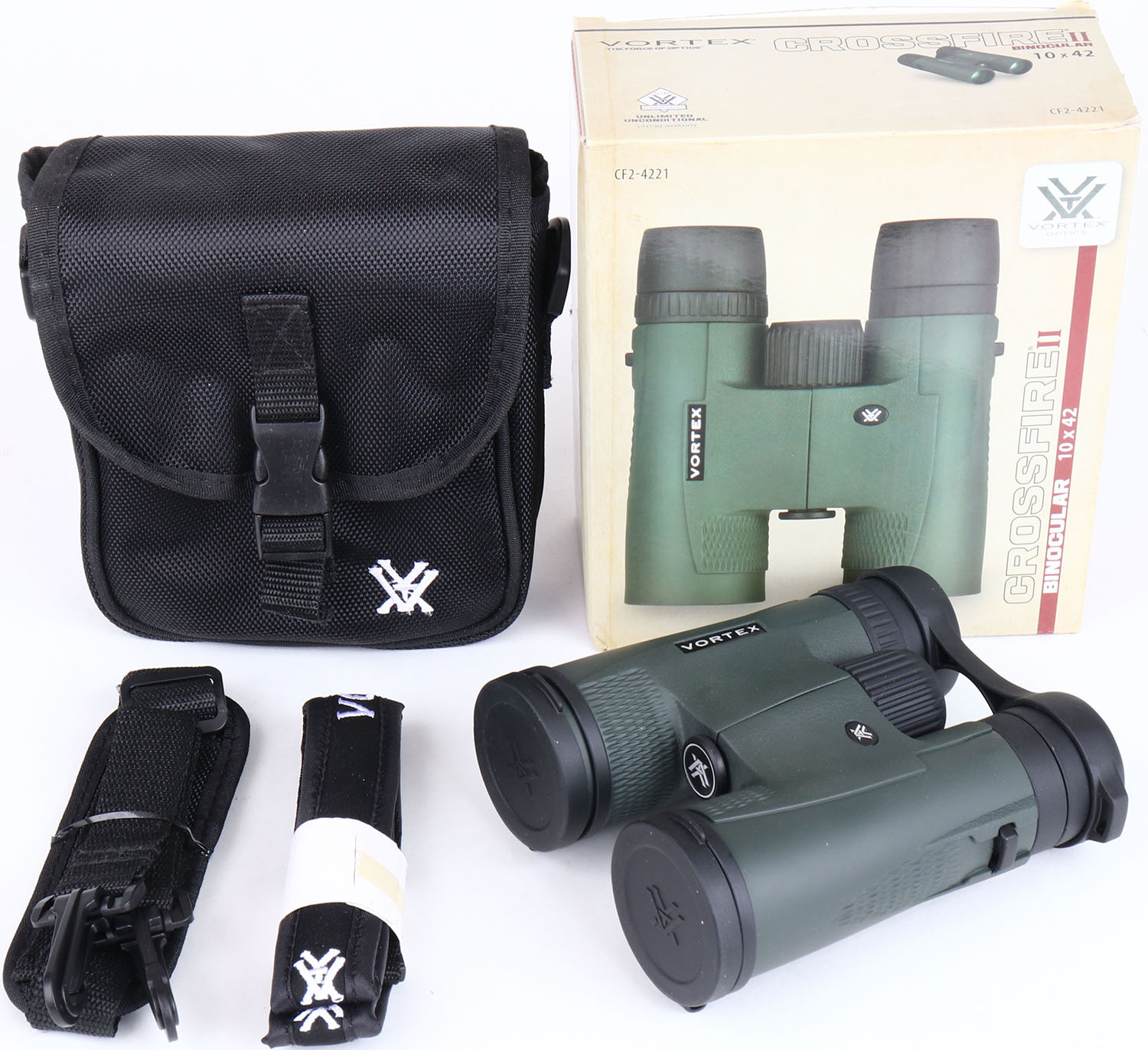 Vortex, Crossfire II, 10x42 Binocular, NIB, comes with carrying case, neck strap, rain guard, tethered lens covers, and lens cleaning cloth, weighs in at 20.8 ounces and has 14mm of eye relief adjustment, as with all vortex products these binoculars come with Vortex's unconditional & unlimited lifetime warrantee. Grade: MINT - Value: 150 to 300