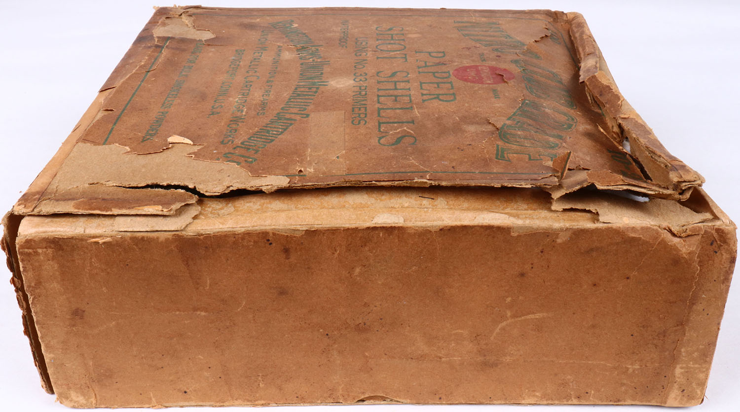 REM-UMC, NITRO CLUB GRADE, 10ga, 2pc., Partial 53% Full of NPE, 2 7/8'', buff box with green and buff label, box has edge wear, scuffing, seam splits, soiling & label is 82% intact. Shells are very good. Grade: Very Good + - Value: 50 to 150