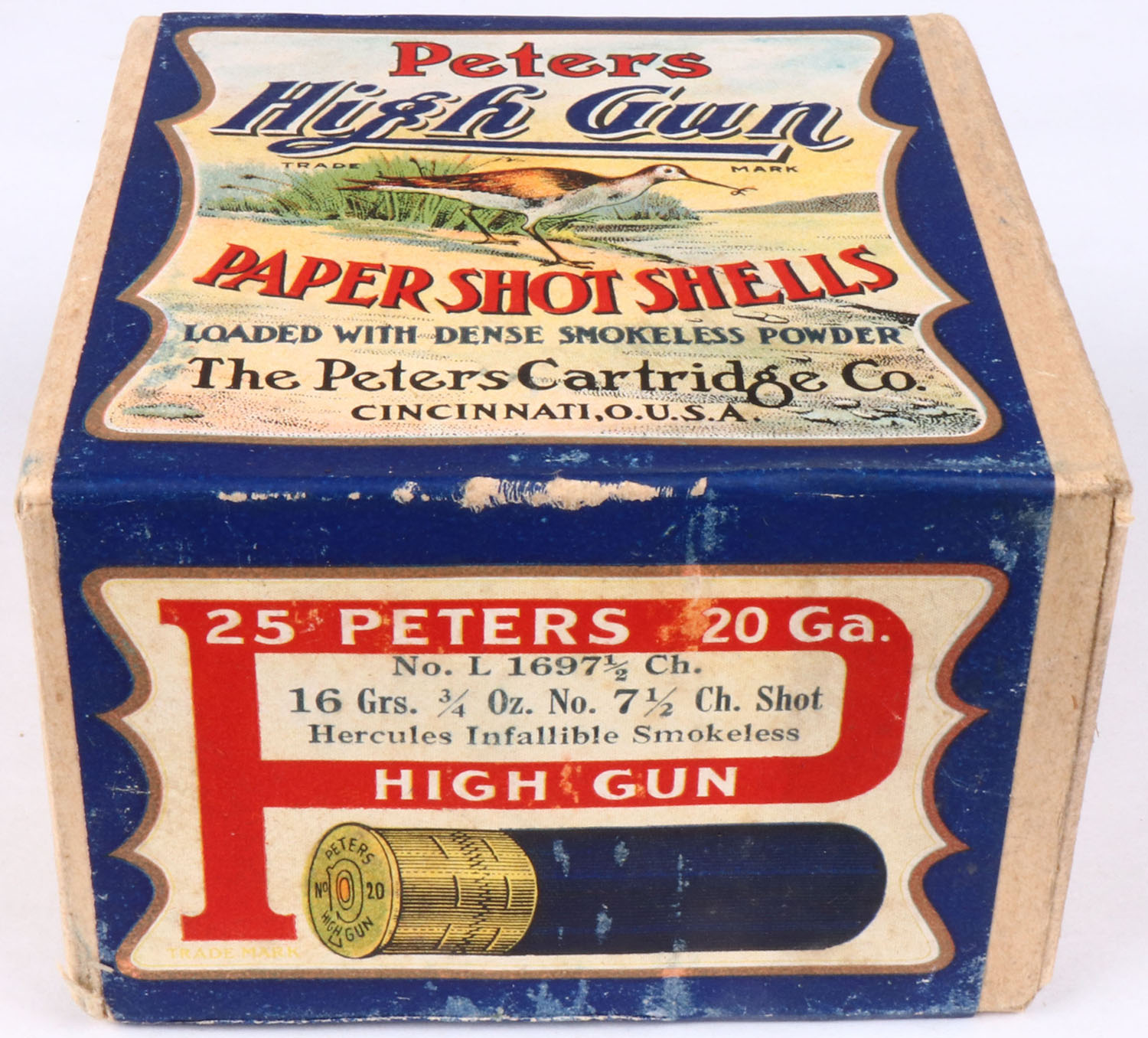 Peters Cart. Co., HIGH GUN, MINT, 20ga, 2pc., FULL & SEALED, shot size 7 1/2 Shot, buff box with multi colored picture of Snipe, Loading: No. L. 1697 1/2 Ch 16 Grs. 3/4Oz. 7 1/2CH Shot, Hercules Infallible Smokeless, box has a VERY small piece torn on one the left side of the box, with Very minimal scuffing. The label is excellent, 100% original. RARE collectible box in this condition. Grade: Excellent ++ - Value: 1000 to 8000
