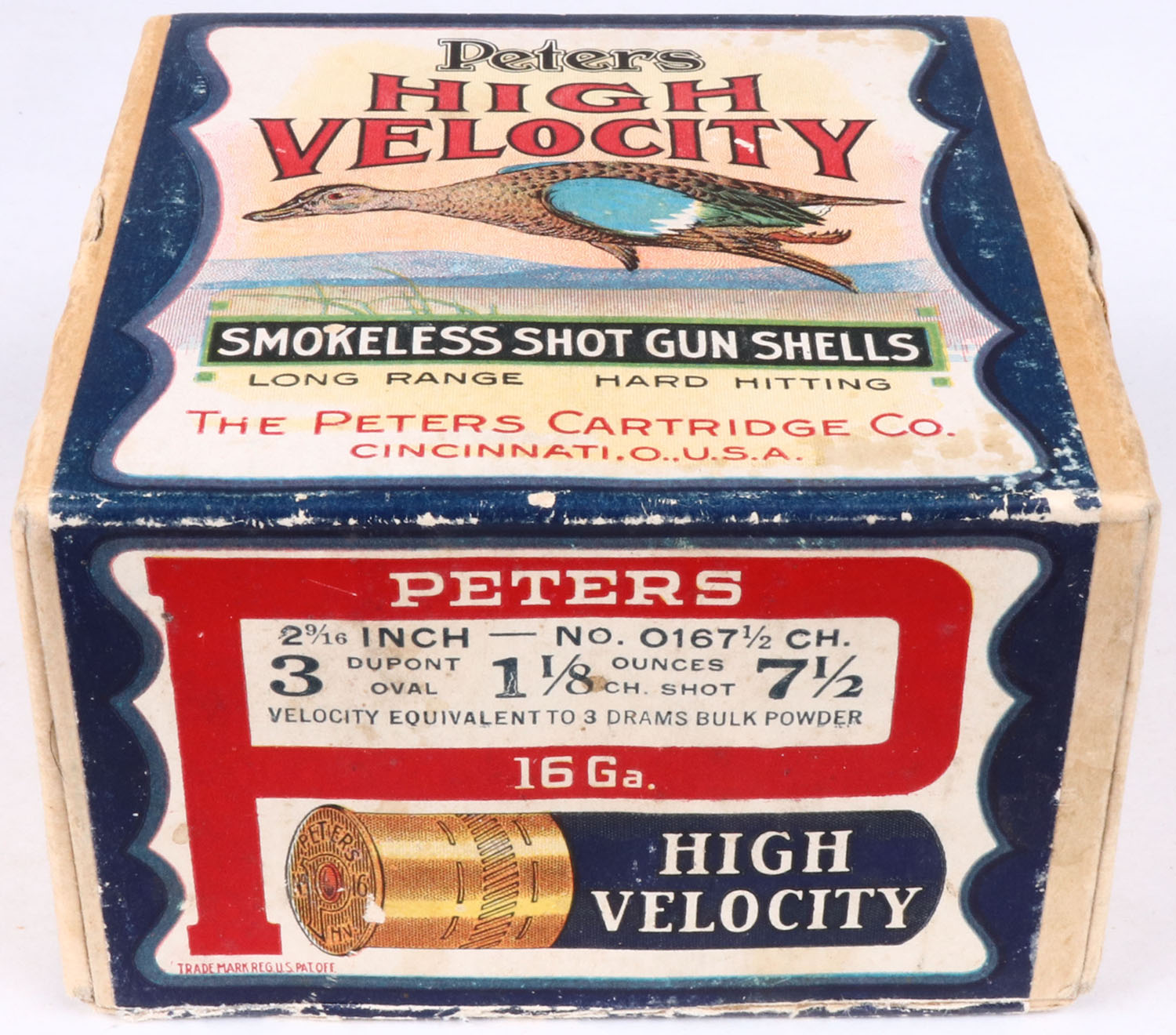 Peters Cart. Co., Blue Wing Teal, 16Ga., 2 9/16'', 2pc., Full, shot size 7 1/2CH, buff box with multi colored label that pictures Blue Wing Teal in flight, box is solid has great label with light soiling, has small shell protrusions, Shells are excellent. Grade: Excellent ++ - Value: 400 to 800
