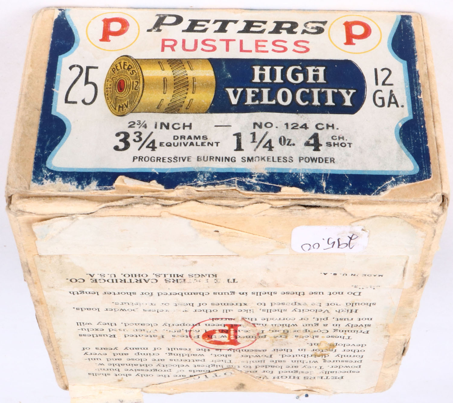 Peters Cart. Co., Blue Bill with insert, 12ga., 2pc., Full, shot size 4CH shot, buff box with multi colored label that pictures Blue Bill in flight, box has light soiling, seam split, edge wear & box is solid with very good colors. Grade: Excellent - Value: 100 to 500