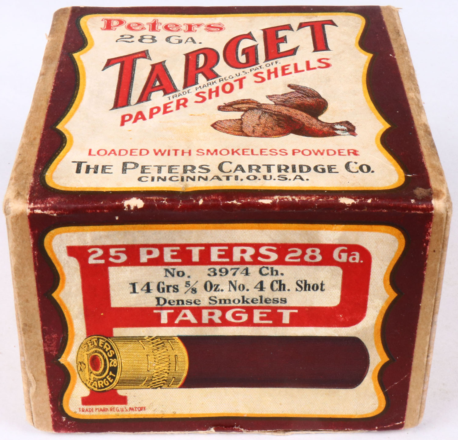 Peters Cart. Co., TARGET, 28ga., 2pc., Empty, shot size 4 Ch Shot, buff box with multi-colored label with Quail in flight, box is very solid with light soiling. Grade: Excellent + - Value: 60 to 200