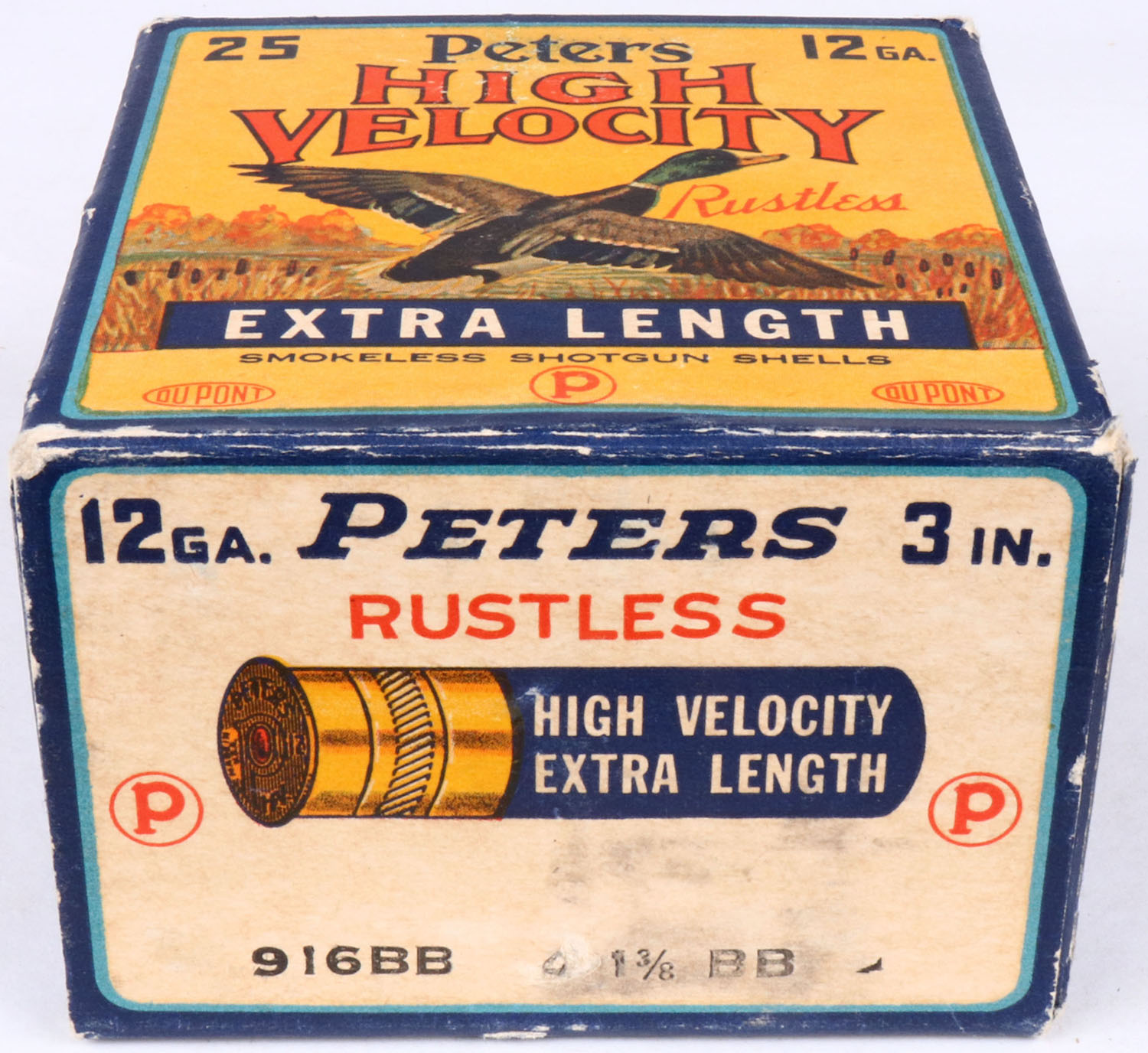 Peters Cart. Co., Bridgeport, CT, High Velocity Extra Length, 12ga., 1pc., Full, 3'', shot size BB, multi colored box that pictures mallard flying out of the marsh grass, box is very solid with great colors & light edge wear, shells are excellent. Grade: Excellent + - Value: 20 to 80