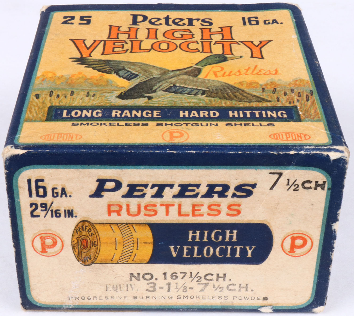 Peters Cart. Co., Kings Mills, OH, High Velocity, 16ga., 1pc., Empty, shot size 7 1/2CH, multi colored box that pictures mallard flying out of the marsh grass, box has light edge wear & light soiling, with very nice colors. Grade: Very Good ++ - Value: 10 to 40