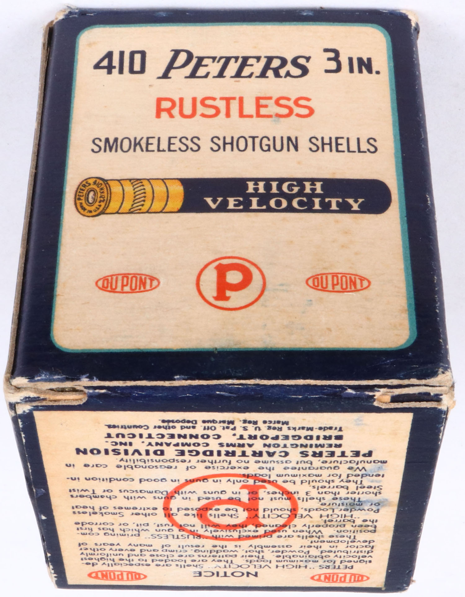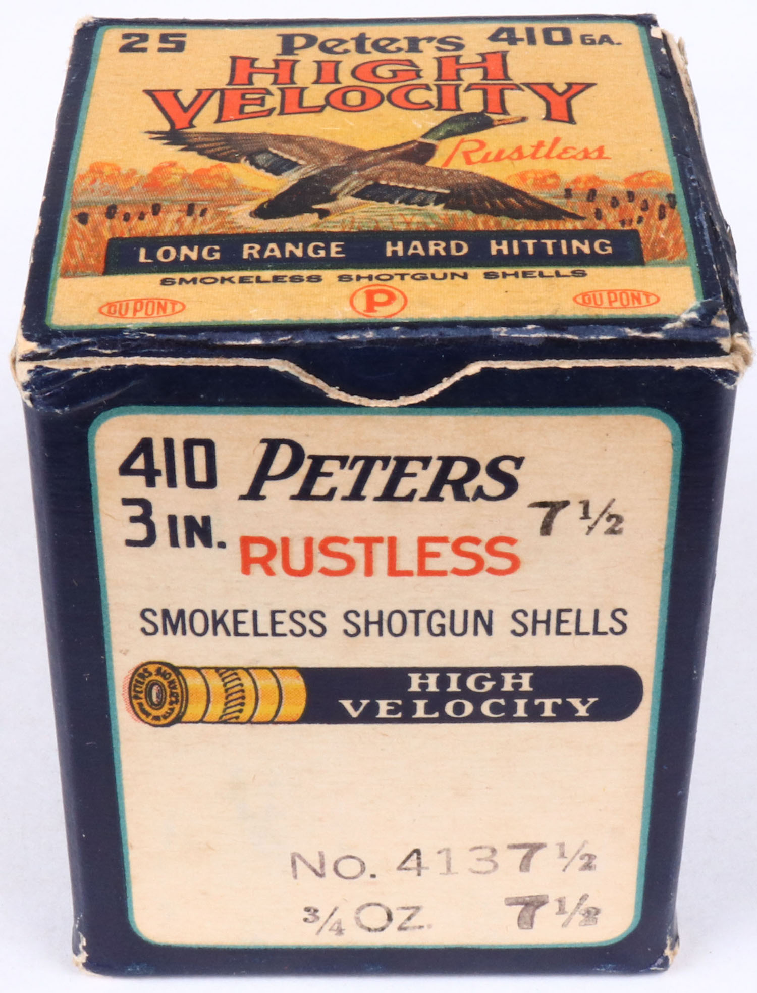 Peters, High Velocity, 410ga., 3'', 1pc., Full, shot size 7 1/2, multi-colored box with mallard duck flying out of marsh grass, box has great colors, Shells are excellent. Grade: Excellent + - Value: 20 to 80