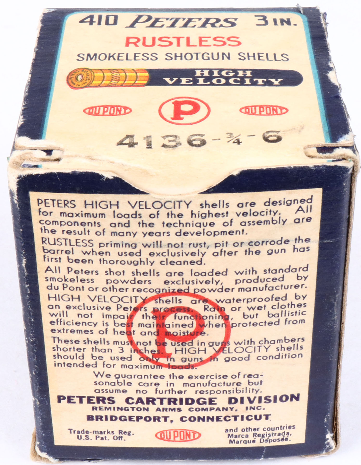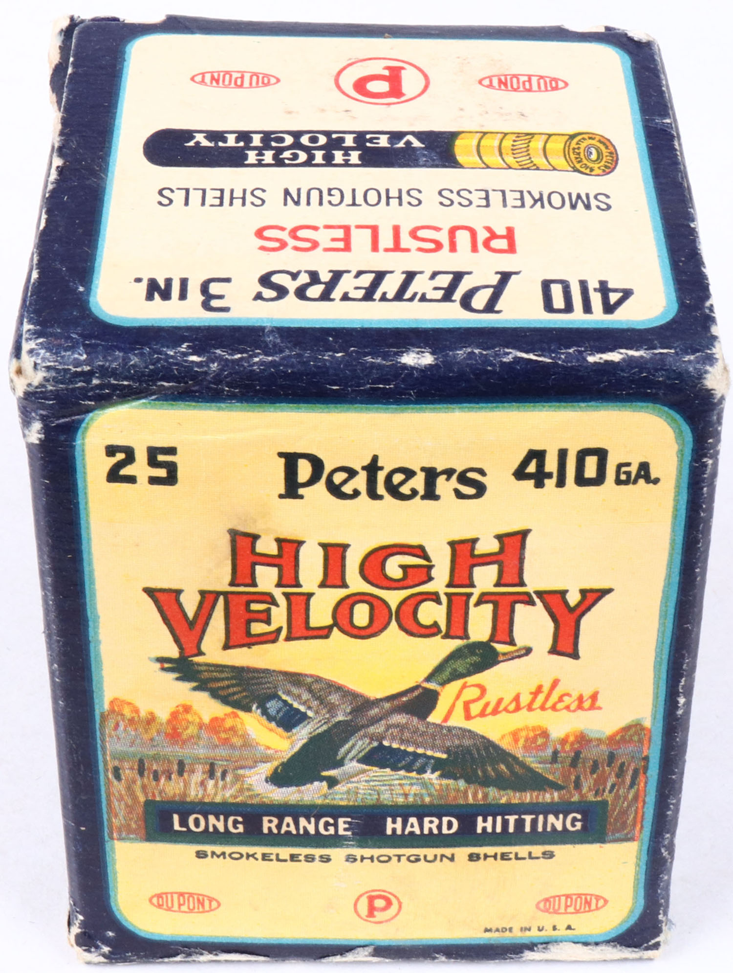 Peters, High Velocity, 410ga., 3'', 1pc., Full, shot size 6, multi-colored box with mallard duck flying out of marsh grass, box is solid with great colors & edge wear, shells are excellent. Grade: Excellent - Value: 20 to 80