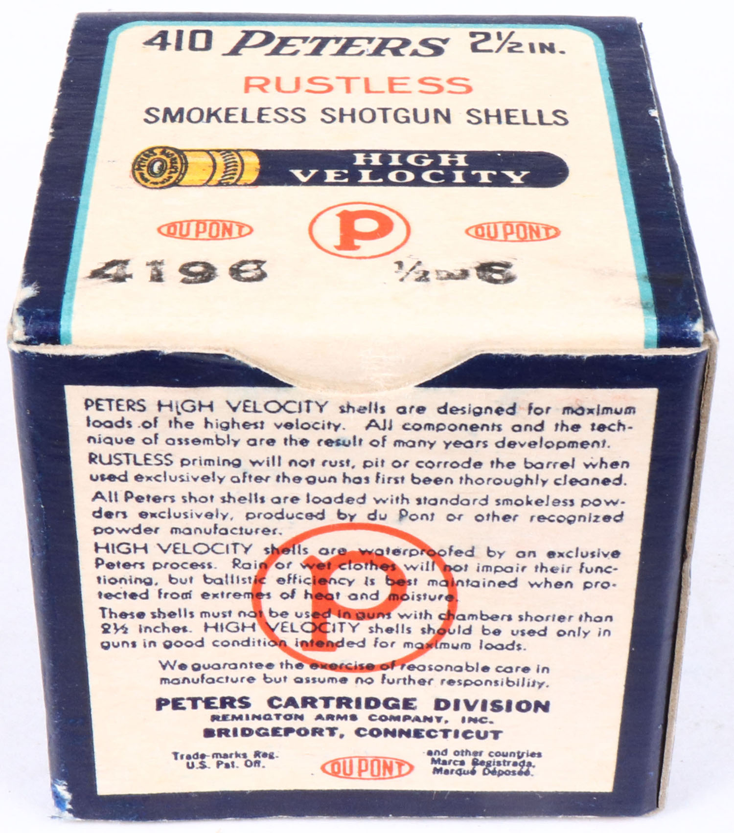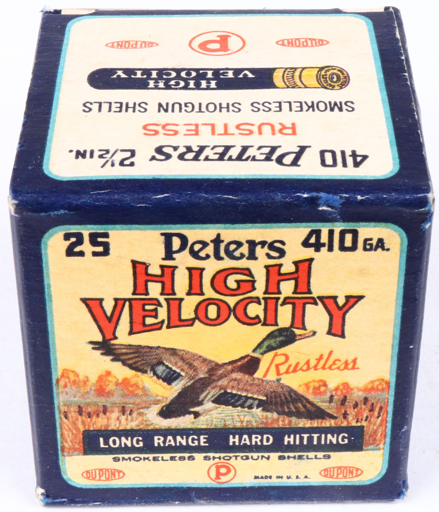 Peters, High Velocity, 410ga., 2 1/2'', 1pc., Full, shot size 6, multi-colored box with mallard duck flying out of marsh grass, box is very solid, with great colors, shells are excellent. Grade: Excellent ++ - Value: 30 to 80