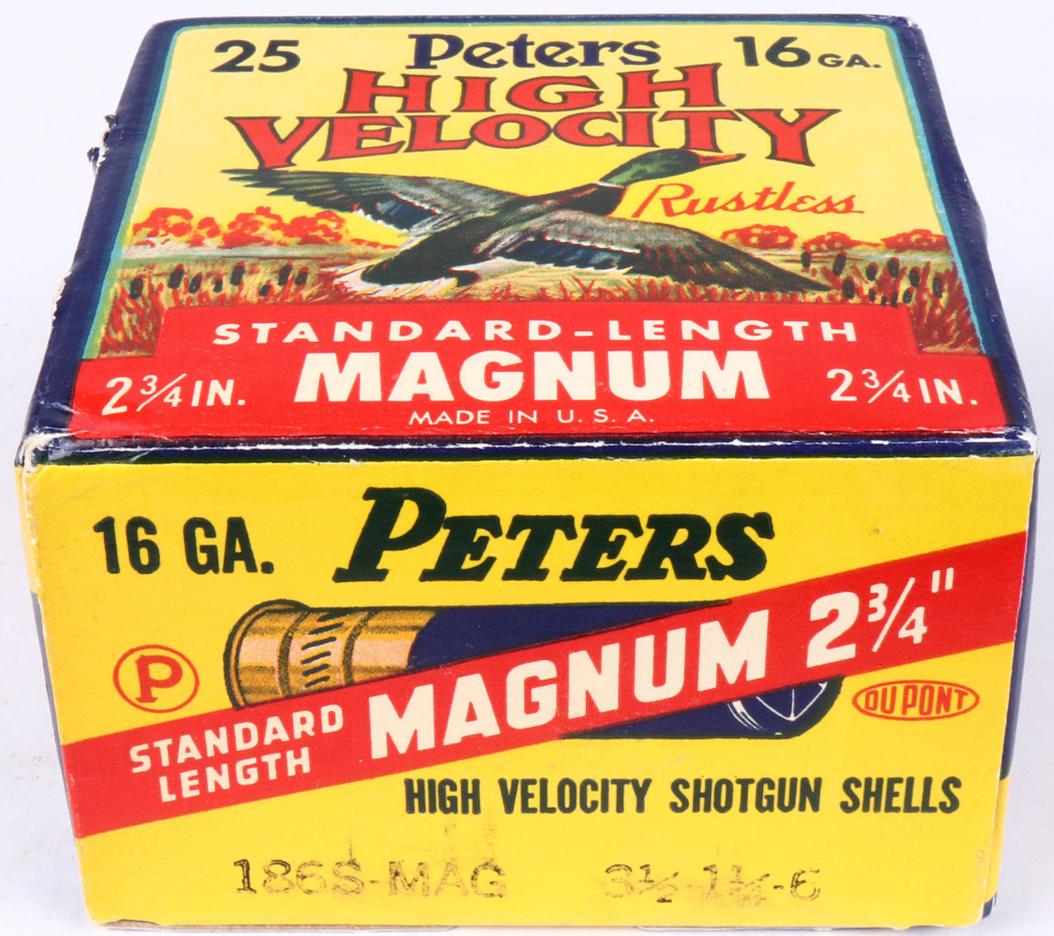 Peters Cart. Co., High Velocity, New Peters Crimp, 16ga., 1pc., Full, shot size 6 Magnum, multi colored box that pictures mallard flying out of the marsh grass, paper shells, box is solid with shell protrusions, Shells are excellent. Grade: Excellent + - Value: 20 to 80