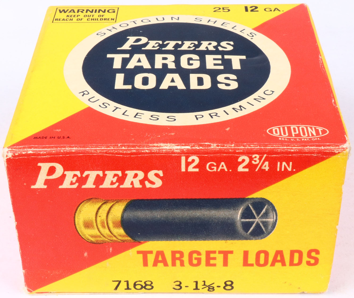 Peters, TARGET LOADS, 12ga., 1pc., Full, shot size 8, red, blue & yellow box, box is very solid with excellent colors, shells are excellent. Grade: Excellent ++ - Value: 10 to 30