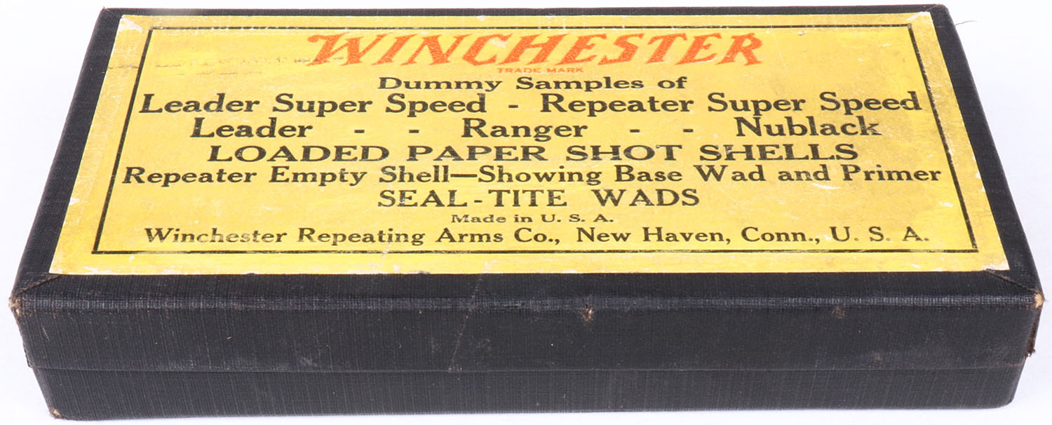 Winchester, Salesman Sample Shotshell box, 2pc., black box with yellow label with red & black print, box is marked Leader Super Speed, Repeater Super Speed, Leader, Ranger, Nublack, Repeater Empty Shell & Seal-Tite Wads, Full and correct with one Seal-Tite Wads Missing, Five Window shells are excellent with one cut-a-way shell, box has scuff on bottom but is solid with crisp label. Grade: Excellent ++ - Value: 200 to 500
