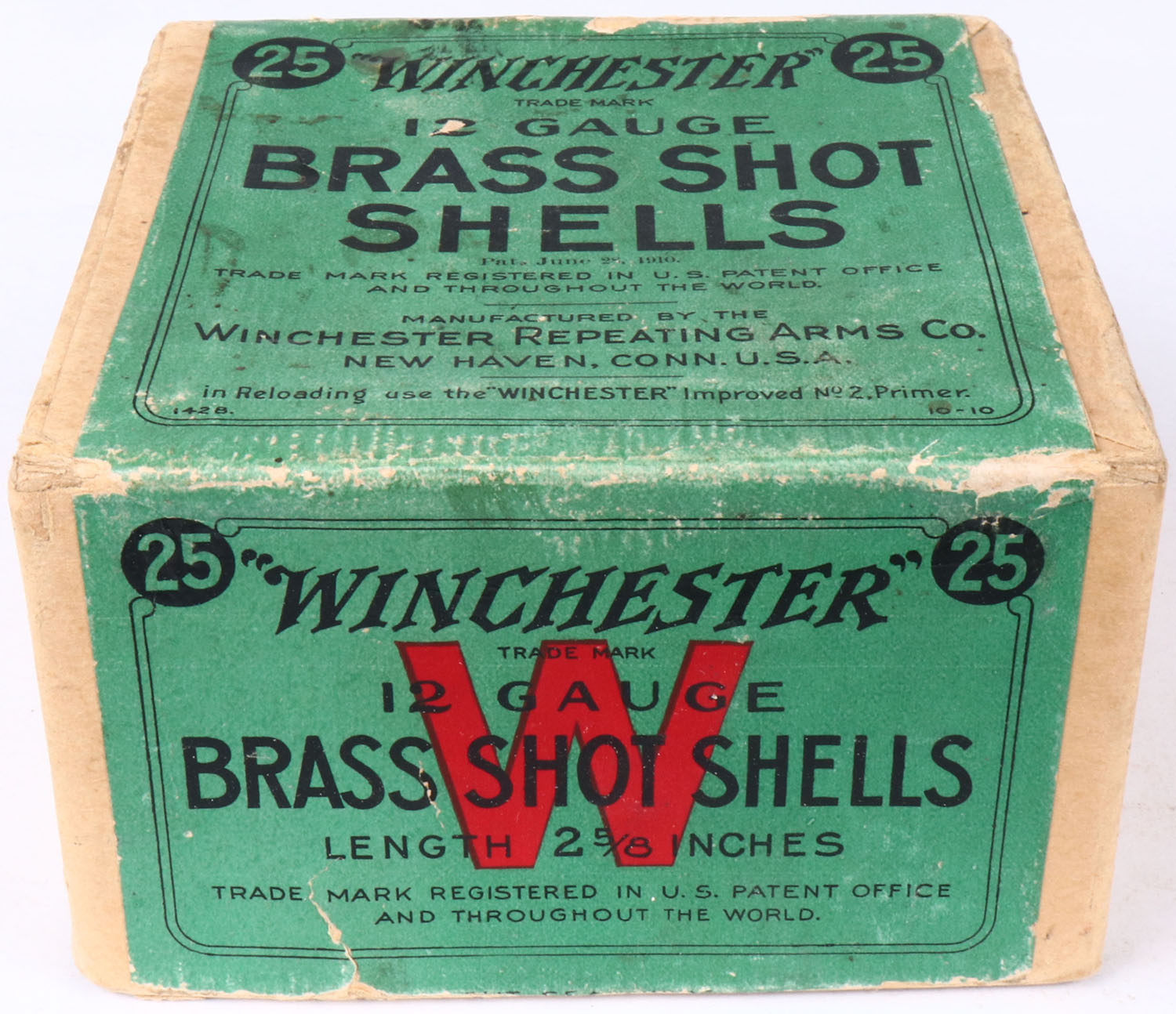Winchester, BRASS SHOT SHELLS, 12ga., 2pc., Empty, 2 5/8'', buff box with green, red & black label, box has light edge wear & seam split, box is solid & has very nice colors to label. Grade: Excellent - Value: 50 to 200