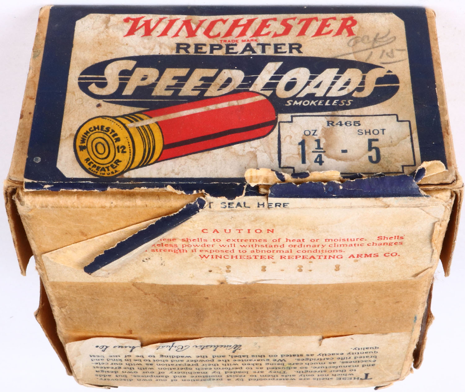 Winchester REPEATER Speed Loads, 12 Gauge, 2pc., Empty., shot size 5, buff box with dark blue red & white paper label, Box is solid with nice colors to label, box has age soiling & torn piece on left side, RARE with the REPEATER markings. Grade: Very Good ++ - Value: 80 to 200