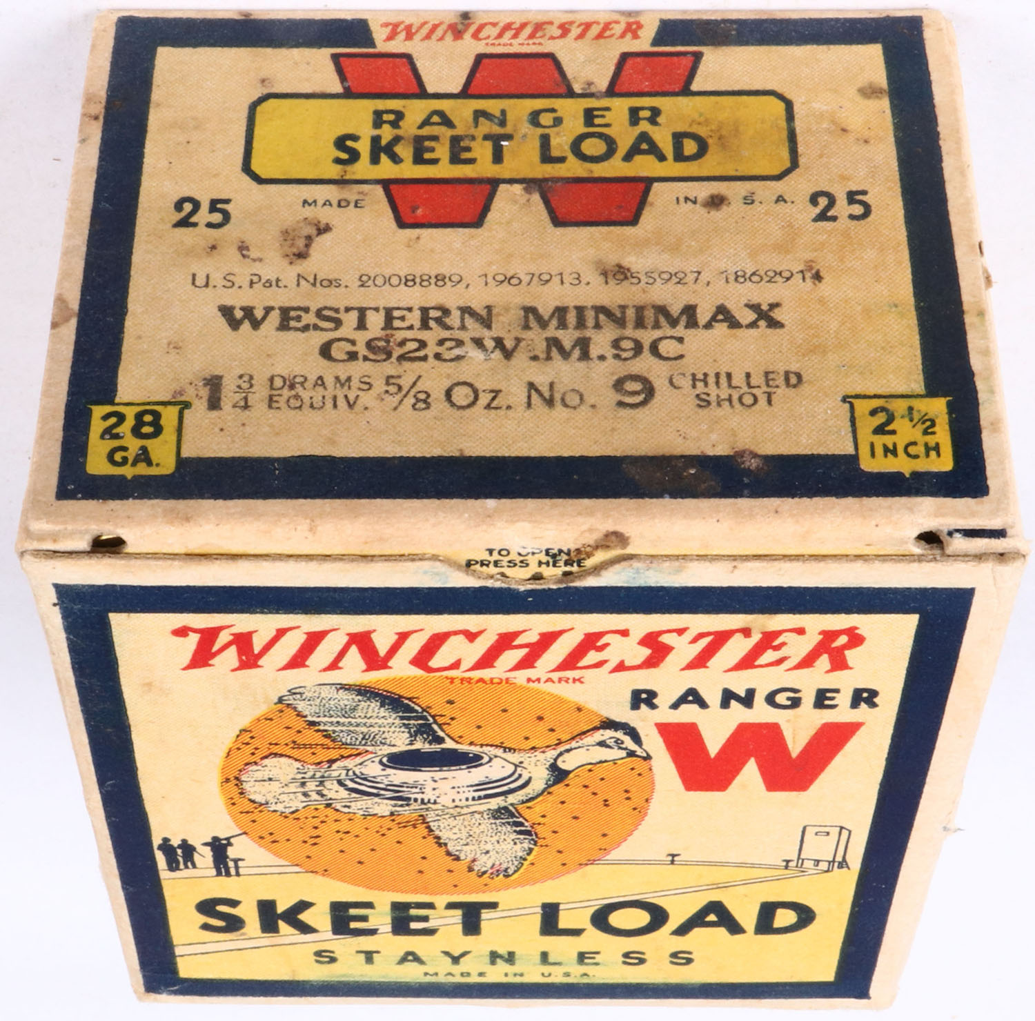 Winchester, RANGER SKEET LOAD, 28ga, 1pc., Full, White, black & red box that pictures flying Quail with skeet in body & shot all around, Staynless, 2 1/2'', Loading: 1 3/4 Drams 5/8 Oz. 9 Chilled Shot, Box is very solid with light soiling & excellent colors, Shells are excellent. RARE BOX. Grade: Excellent + - Value: 200 to 800