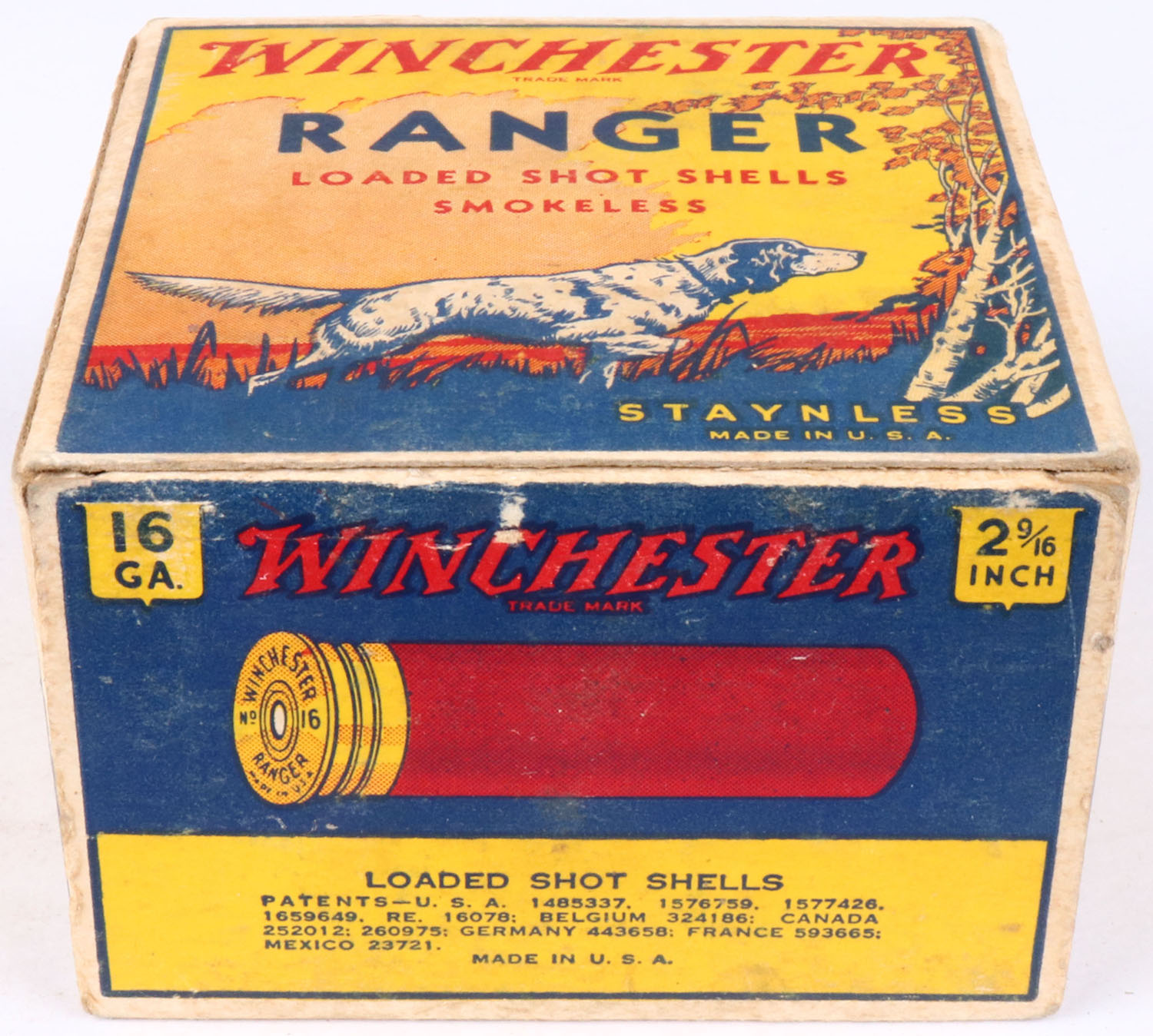 Winchester, Ranger, 12ga, 1pc., Empty, Shot Size 5 Chilled, multi colored box, dog on point, 2 9/16'', box has top inside flap disconnected with great colors. Grade: Excellent - Value: 40 to 100