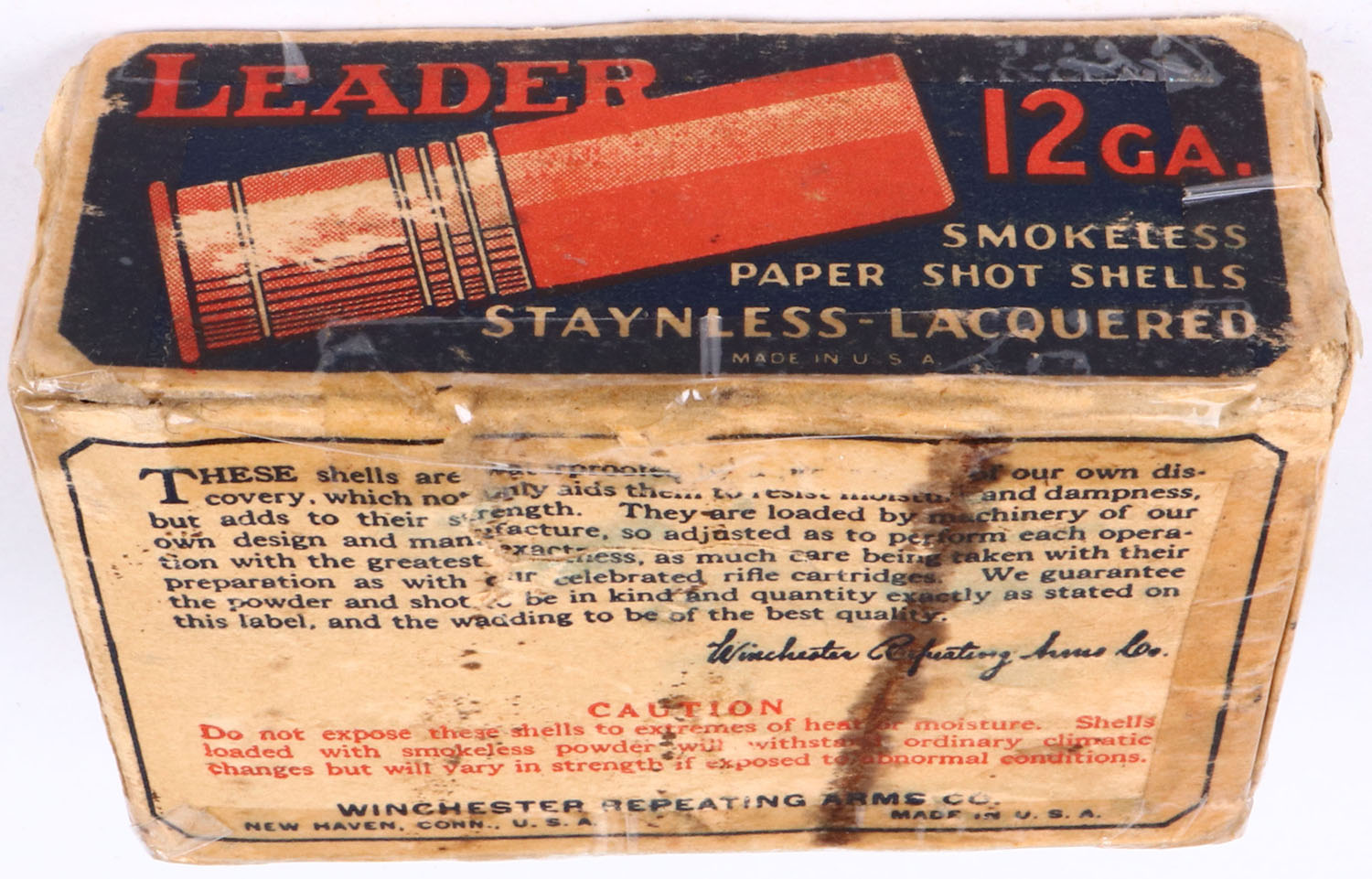 Winchester, LEADER, LACQUERED and STAYNLESS, 12ga., 1pc., Full, shot size 8, Buff, red and blue box colors are very nice, 2 5/8'', box has tape repair, seam splits, soiling & scuffing with missing inside top flap, shells are Exceptional, VERY SCARCE BOX!!! Grade: Very Good + - Value: 80 to 200