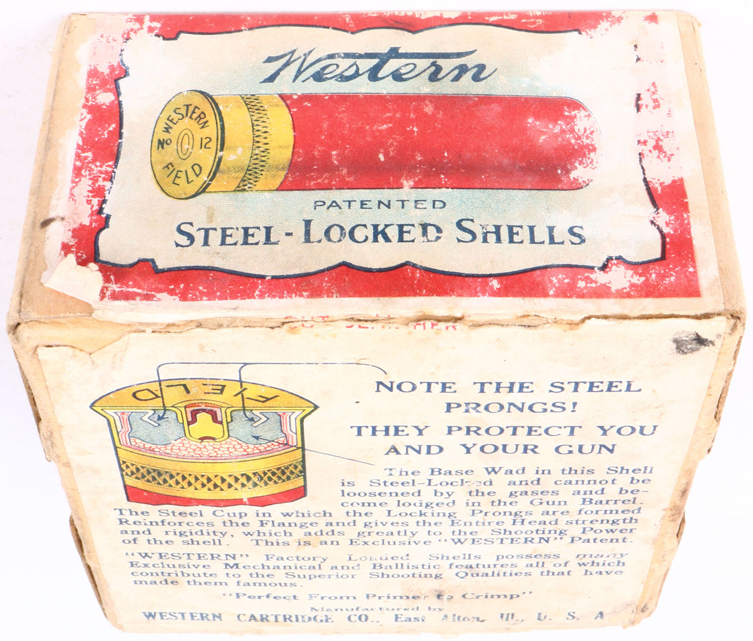Western, Field, 12ga., 2pc, Full, shot size 7 1/2 Chilled, box has soiling, scuffing & shell protrusions with very good label, Shells are excellent. Grade: Excellent - Value: 50 to 250