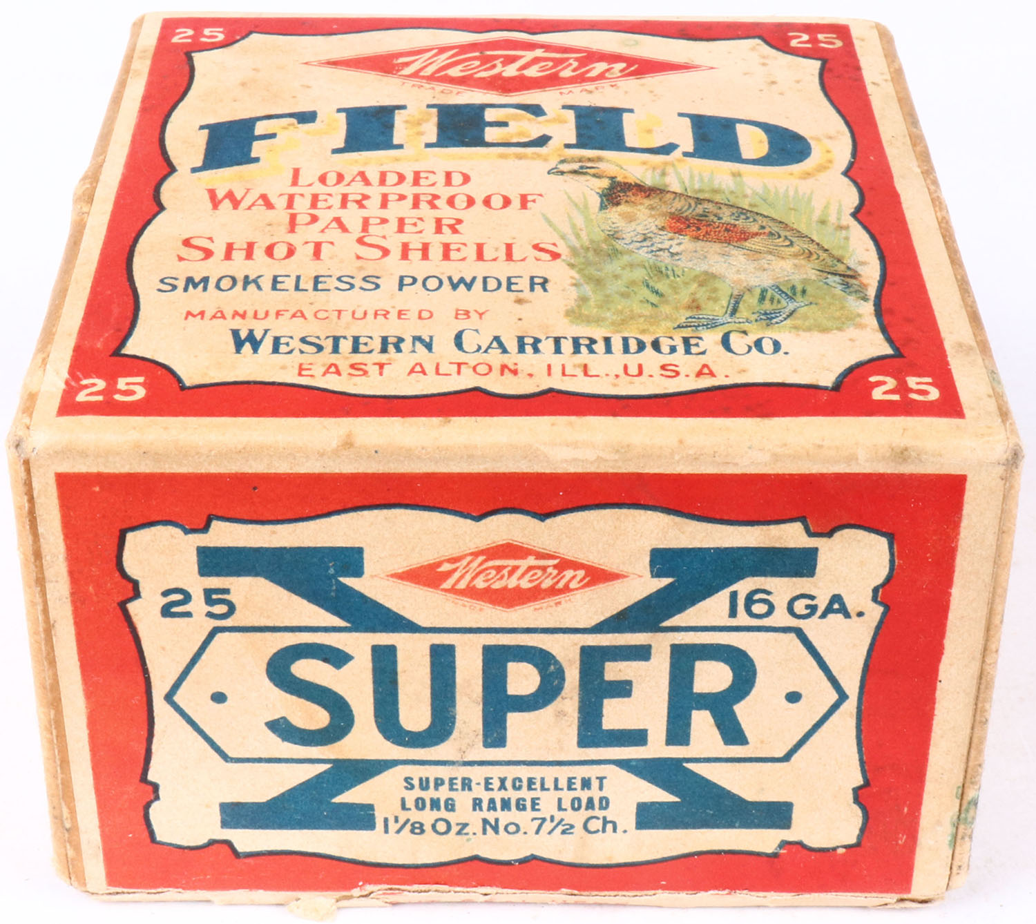 Western, Field/Super X, with two of the same inserts, Label was made during transition from Field boxes to Super X boxes. 16ga., 2pc, Full, shot size 7 1/2 Ch, box has light age soiling with very good label, Shells are excellent. Grade: Excellent - Value: 50 to 200