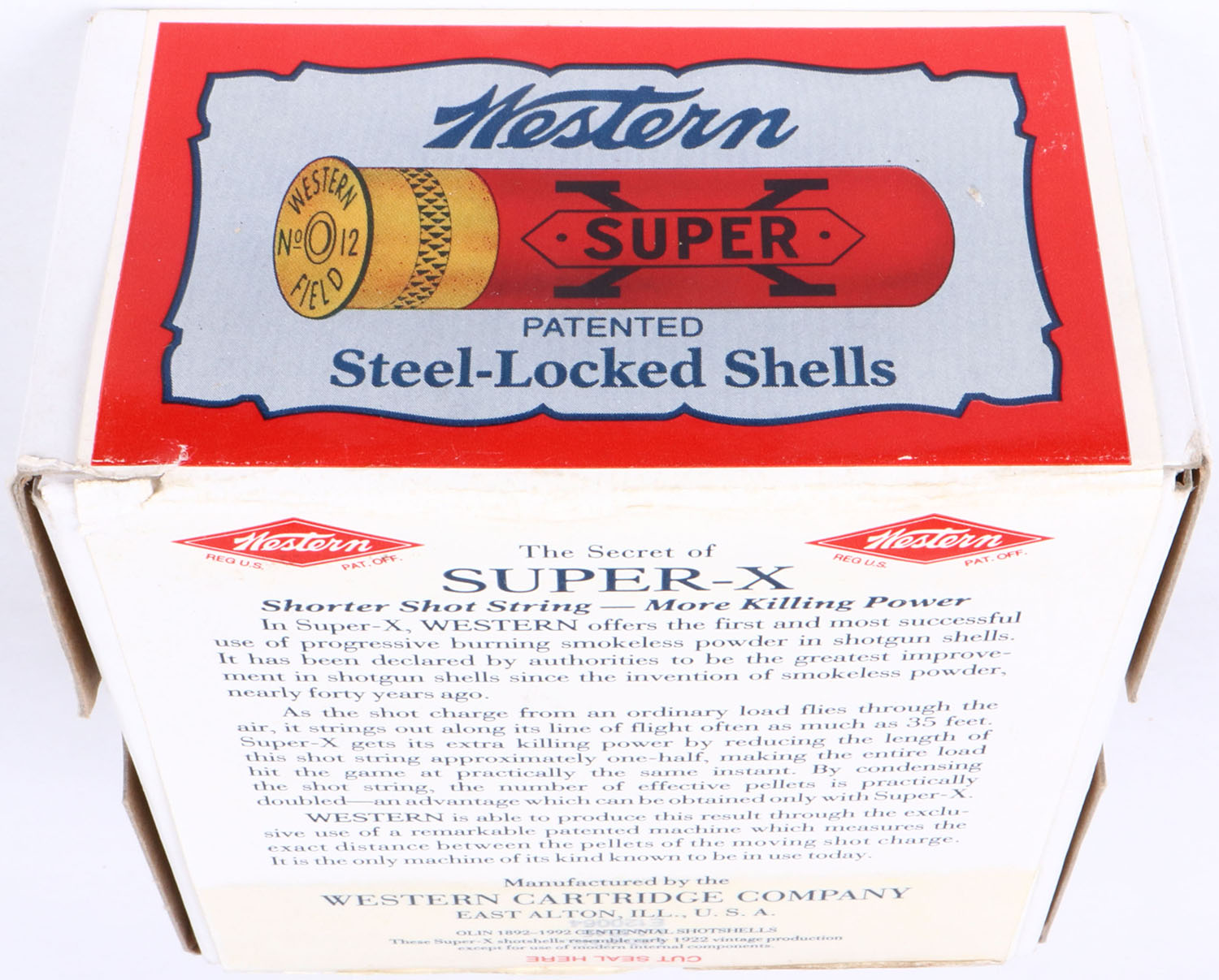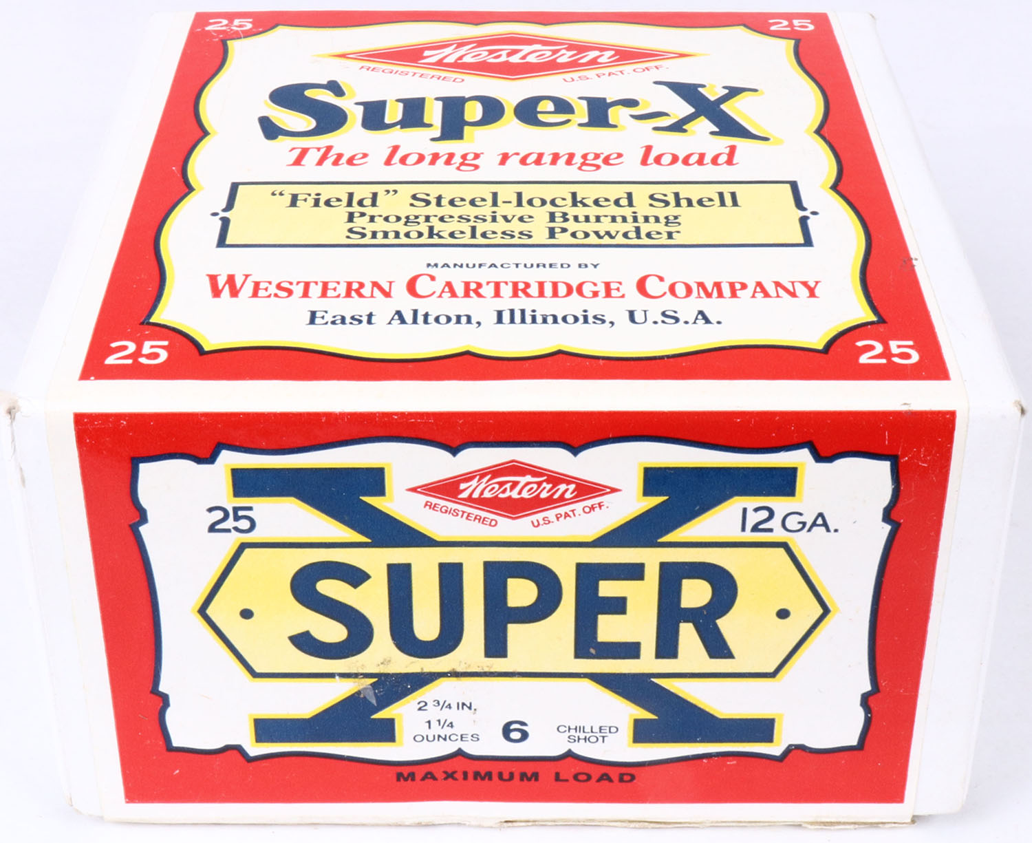Western, Super-X, 12ga., 2pc., FULL & SEALED, shot size 6 Chilled Shot, 2 3/4'', white box with multi colored label, box & label are great, Circa 1990's. Grade: Excellent ++ - Value: 30 to 80