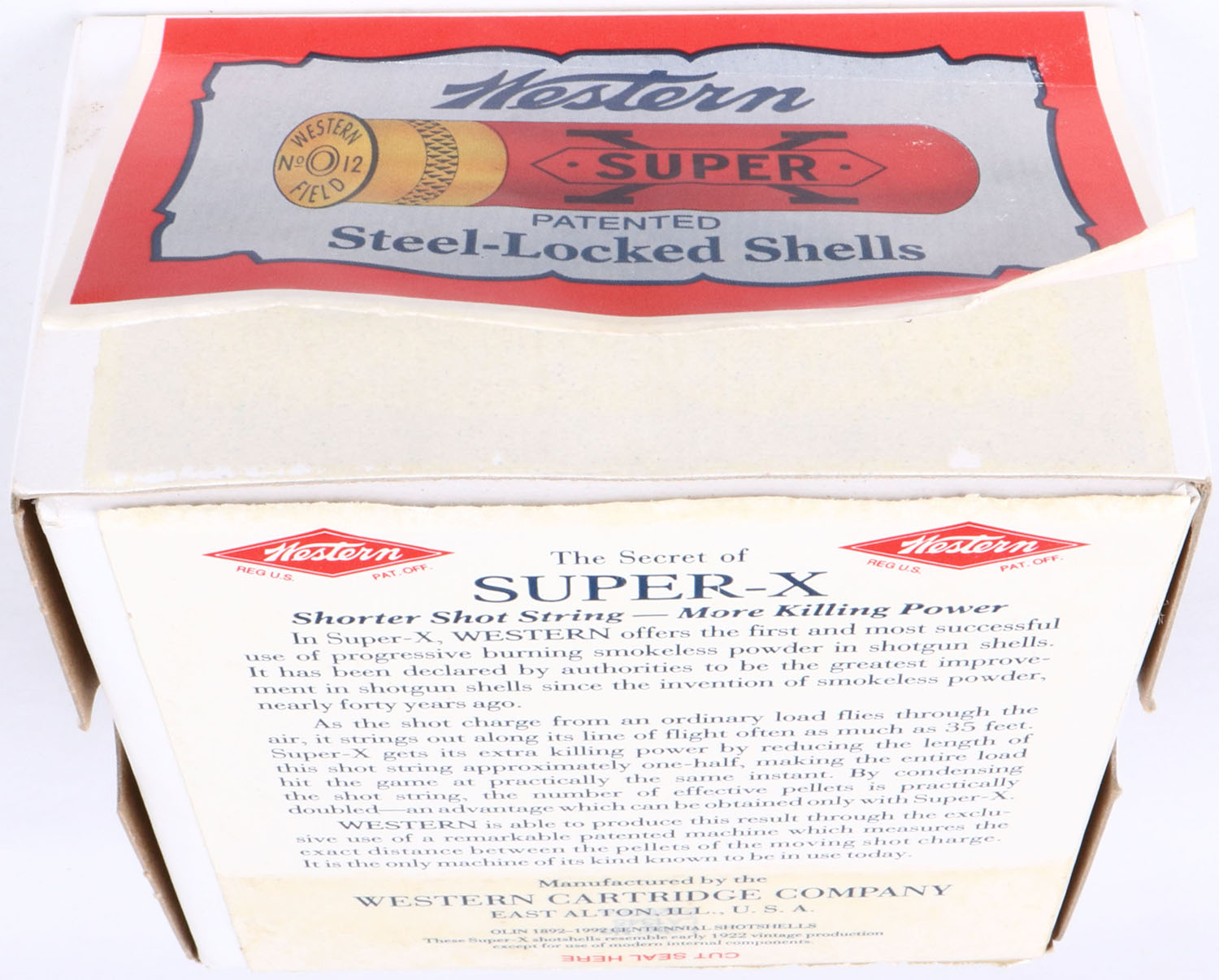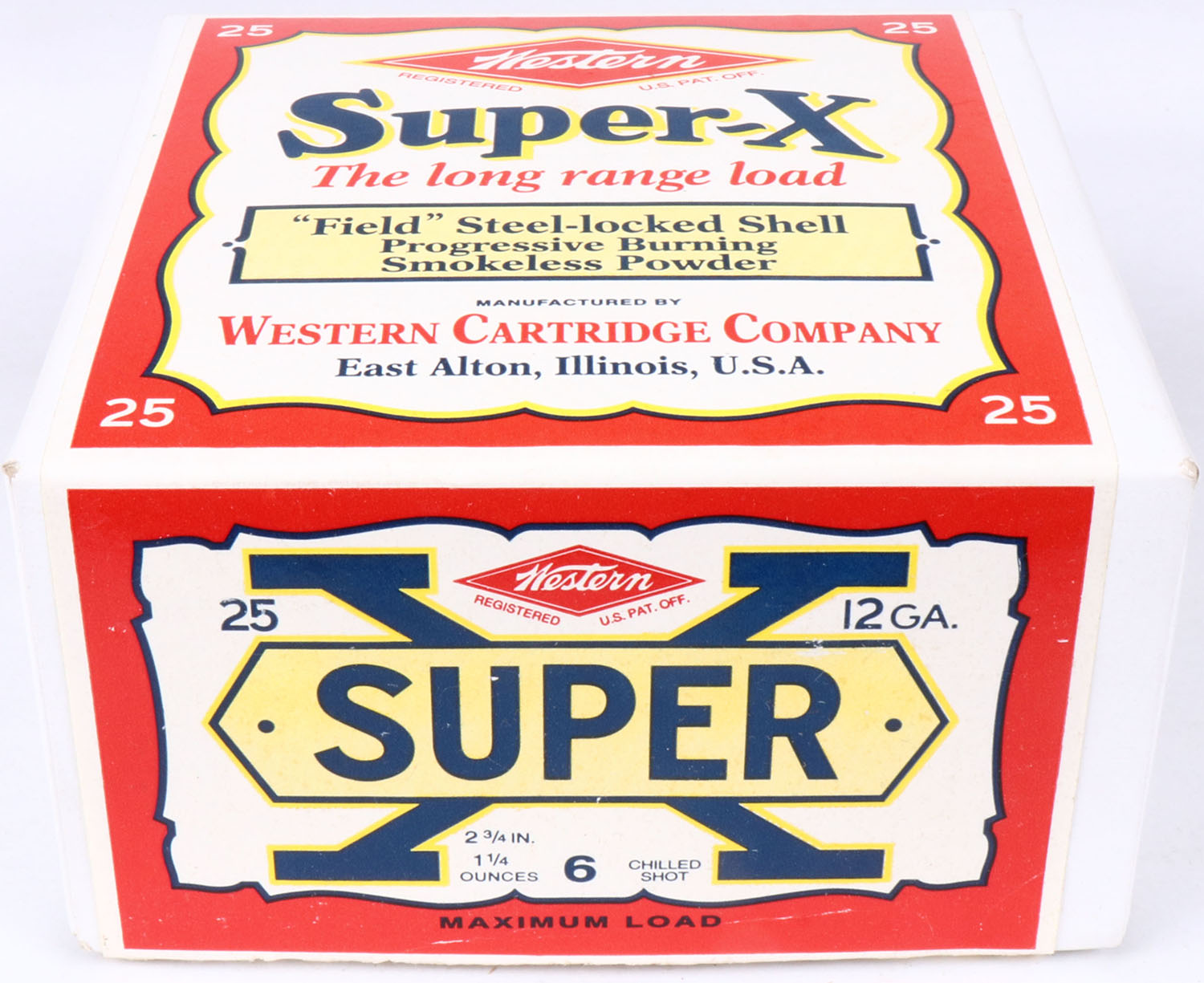 Western, Super-X, 12ga., 2pc., Full, shot size 6 Chilled Shot, 2 3/4'', white box with multi colored label, box & label are great, Circa 1990's, Shells are excellent. Grade: Excellent ++ - Value: 30 to 80