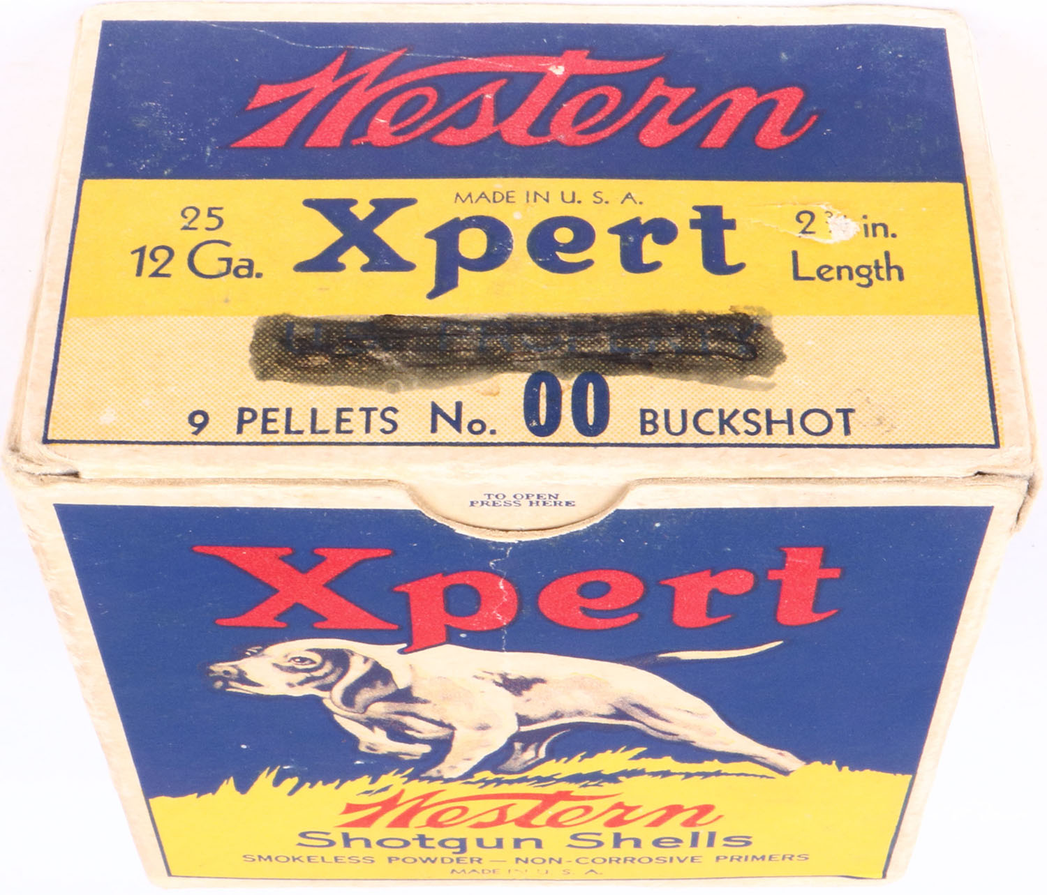 Western Cart. Co., Xpert, with U.S. PROPERTY blacked out, 12ga., 1pc., Partial 23rds., blue, yellow & red box with a dog on point, Loading: 9 Pellets No. 00 BUCKSHOT, box has minor scuffing with great colors, shells are excellent. Grade: Excellent + - Value: 30 to 120