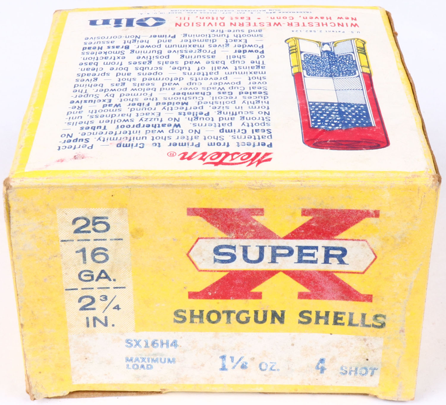 Western, Super X, 16ga., 2 3/4'', 1pc., Partial 20rds., shot size 4, multi-colored box, box is solid with age soiling & scuffing, box has very nice colors, shells are excellent. Grade: Very Good ++ - Value: 2 to 30